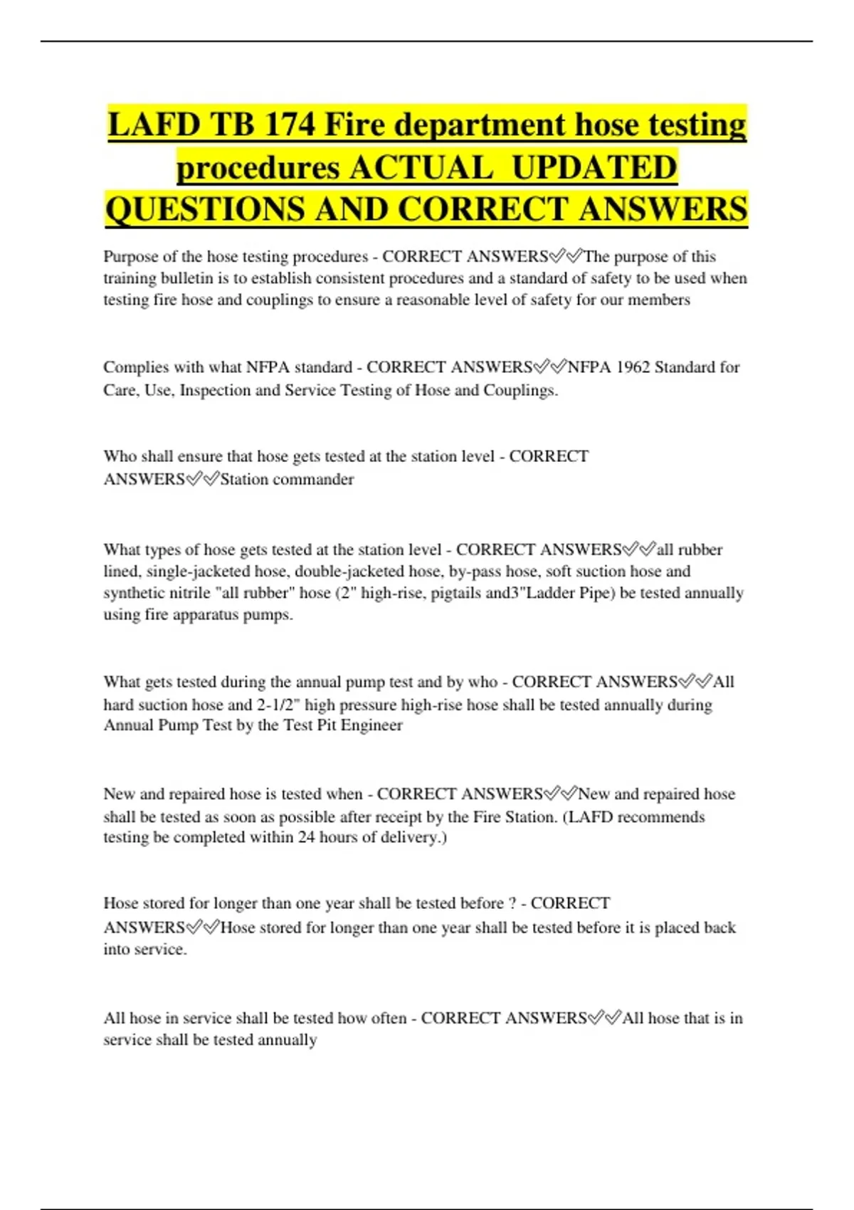 LAFD TB 174 Fire department hose testing procedures ACTUAL UPDATED QUESTIONS AND CORRECT ANSWERS Purpose of the hose testing procedures - CORRECT ANSWERSThe purpose of this training bulletin is to establish consistent procedures and a standard of safety to be used when testing fire hose and couplings to ensure a reasonable level of safety for our members Complies with what NFPA standard - CORRECT ANSWERSNFPA 1962 Standard for Care, Use, Inspection and Service Testing of Hose and Couplings. Who shall ensure that hose gets tested at the station level - CORRECT ANSWERSStation commander What types of hose gets tested at the station level - CORRECT ANSWERSall rubber lined, single-jacketed hose, double-jacketed hose, by-pass hose, soft suction hose and synthetic nitrile "all rubber" hose (2" high-rise, pigtails and3"Ladder Pipe) be tested annually using fire apparatus pumps. What gets tested during the annual pump test and by who - CORRECT ANSWERSAll hard suction hose and 2-1/2" high pressure high-rise hose shall be tested annually during Annual Pump Test by the Test Pit Engineer New and repaired hose is tested when - CORRECT ANSWERSNew and repaired hose shall be tested as soon as possible after receipt by the Fire Station. (LAFD recommends testing be completed within 24 hours of delivery.) Hose stored for longer than one year shall be tested before ? - CORRECT ANSWERSHose stored for longer than one year shall be tested before it is placed back into service. All hose in service shall be tested how often - CORRECT ANSWERSAll hose that is in service shall be tested annually Hand lines that are dirty or damp shall be changed when ? - CORRECT ANSWERSFirefighting hand lines (1", 1-1/2", 1-3/4", 2-1/2") shall be changed within 24 hours when damp or dirty. Fabric jacketed supply lines shall be changed how often if damp or dirty - CORRECT ANSWERSFabric jacketed supply lines (including by-passes and soft suctions)shall be changed weekly, or more frequently, if damp or dirty. Hose shall be loaded how - CORRECT ANSWERSHose carried on fire apparatus shall be loaded in such a way that air can circulate under the hose to eliminate or reduce growth of mildew in the hose jacket or rust and/or corrosion in the hose bed. True or False Hose shall be kept out of direct sunlight. - CORRECT ANSWERSTrue What to do to prevent damage and the setting of permanent folds in the rubber lining - CORRECT ANSWERSHose shall be removed from apparatus and reloaded with