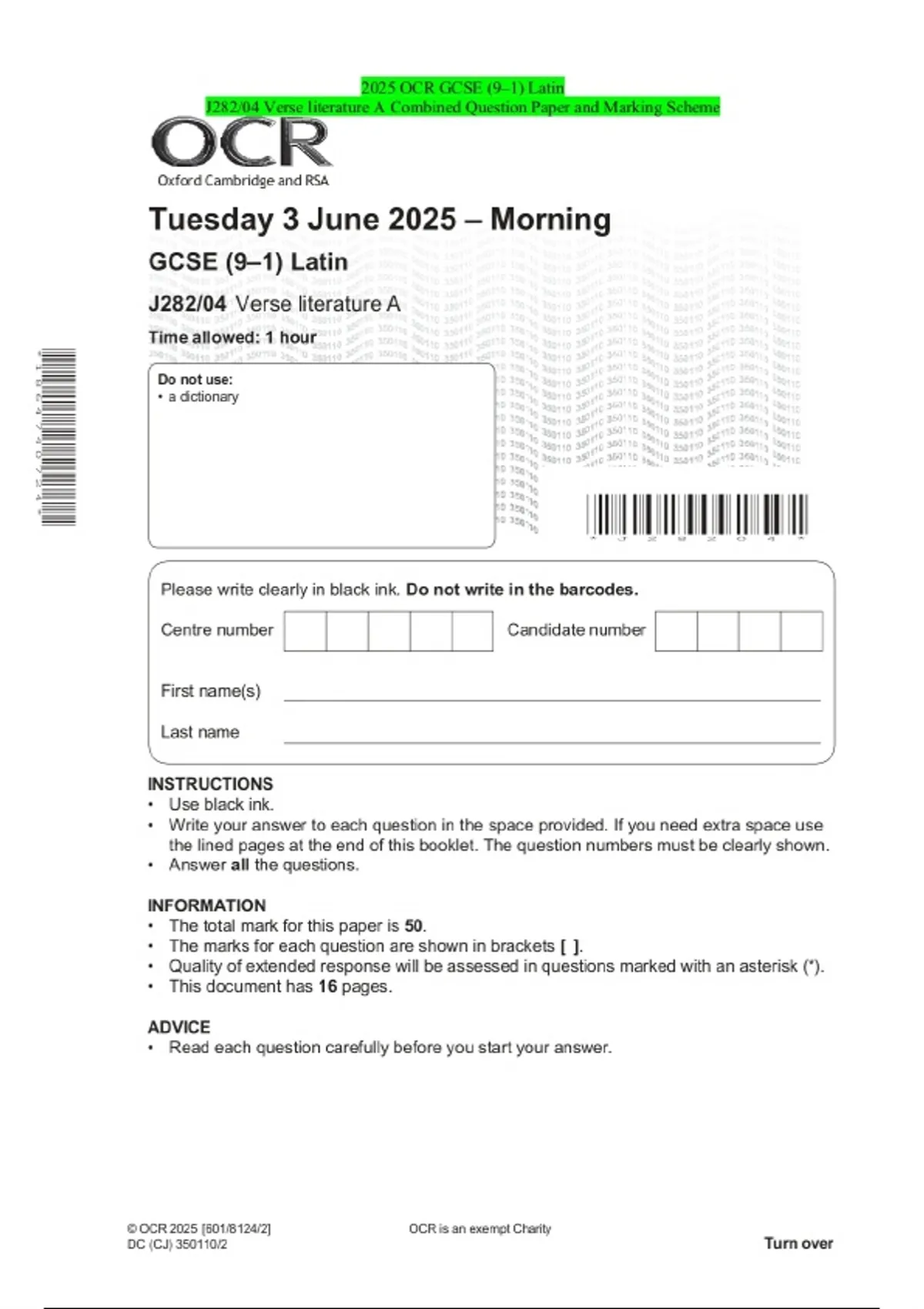 PACKAGE DEAL-::2025 OCR GCSE (9–1) Latin J282/05 Verse Literature Exams|Combined Question Paper and Final Marking Scheme