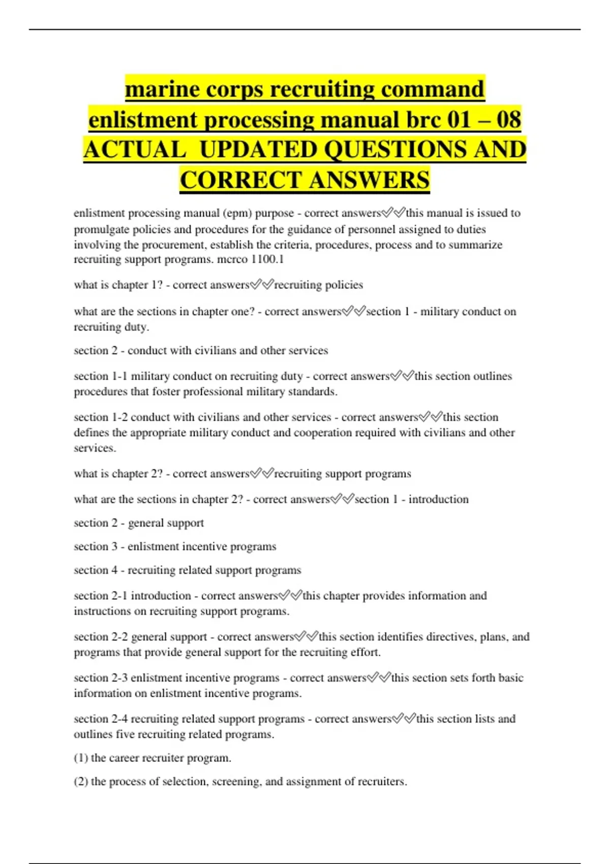 marine corps recruiting command enlistment processing manual brc 01 – 08 ACTUAL UPDATED QUESTIONS AND CORRECT ANSWERS enlistment processing manual (epm) purpose - correct answersthis manual is issued to promulgate policies and procedures for the guidance of personnel assigned to duties involving the procurement, establish the criteria, procedures, process and to summarize recruiting support programs. mcrco 1100.1 what is chapter 1? - correct answersrecruiting policies what are the sections in chapter one? - correct answerssection 1 - military conduct on recruiting duty. section 2 - conduct with civilians and other services section 1-1 military conduct on recruiting duty - correct answersthis section outlines procedures that foster professional military standards. section 1-2 conduct with civilians and other services - correct answersthis section defines the appropriate military conduct and cooperation required with civilians and other services. what is chapter 2? - correct answersrecruiting support programs what are the sections in chapter 2? - correct answerssection 1 - introduction section 2 - general support section 3 - enlistment incentive programs section 4 - recruiting related support programs section 2-1 introduction - correct answersthis chapter provides information and instructions on recruiting support programs. section 2-2 general support - correct answersthis section identifies directives, plans, and programs that provide general support for the recruiting effort. section 2-3 enlistment incentive programs - correct answersthis section sets forth basic information on enlistment incentive programs. section 2-4 recruiting related support programs - correct answersthis section lists and outlines five recruiting related programs. (1) the career recruiter program. (2) the process of selection, screening, and assignment of recruiters. (3) the reserve extended active duty (ead) recruiter program. (4) the recruiter aide program. (5) the command recruiting program. what is chapter 3? - correct answersqualifications for enlistment what are the sections in chapter 3? - correct answerssection 1 - introduction section 2 - enlistment criteria section 3 - waivers of enlistment criteria figure table section 3-1 introduction - correct answersthis chapter provides definiti