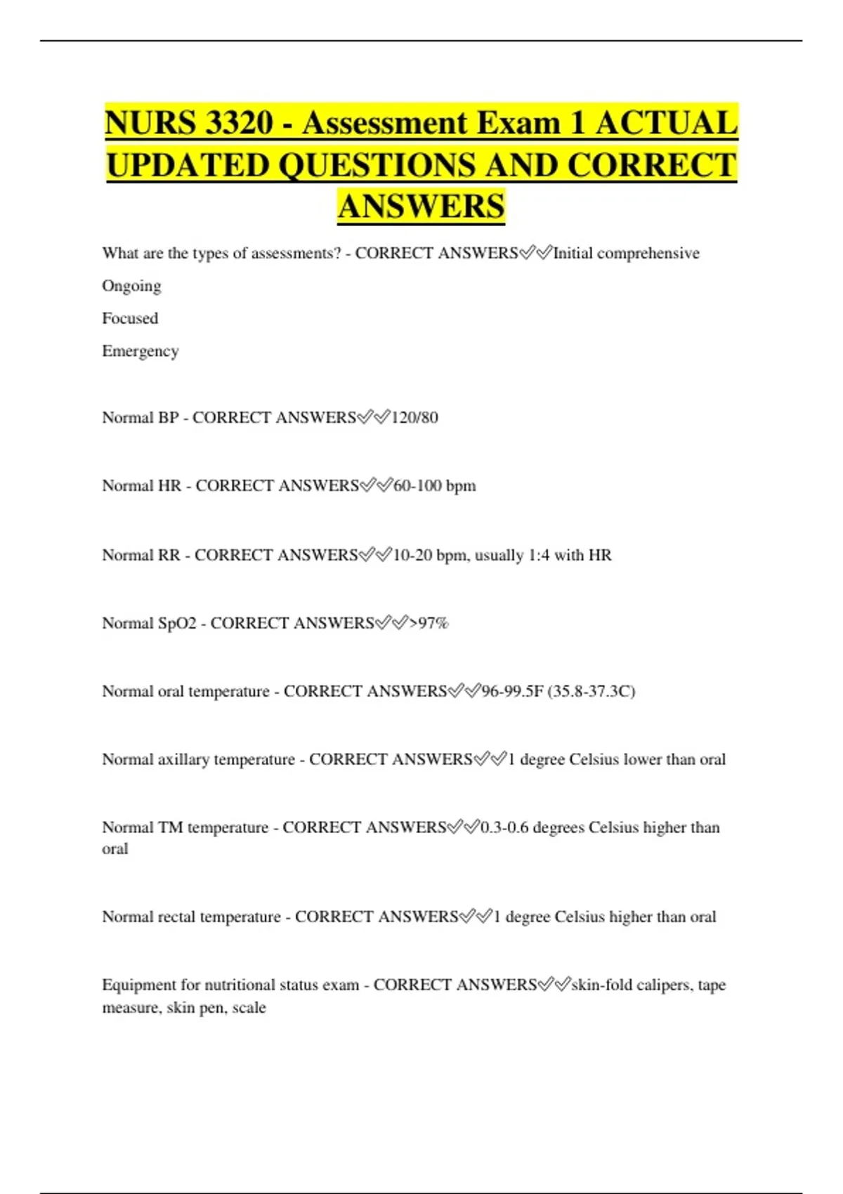 NURS 3320 - Assessment Exam 1 ACTUAL UPDATED QUESTIONS AND CORRECT ANSWERS What are the types of assessments? - CORRECT ANSWERSInitial comprehensive Ongoing Focused Emergency Normal BP - CORRECT ANSWERS120/80 Normal HR - CORRECT ANSWERS60-100 bpm Normal RR - CORRECT ANSWERS10-20 bpm, usually 1:4 with HR Normal SpO2 - CORRECT ANSWERS>97% Normal oral temperature - CORRECT ANSWERS96-99.5F (35.8-37.3C) Normal axillary temperature - CORRECT ANSWERS1 degree Celsius lower than oral Normal TM temperature - CORRECT ANSWERS0.3-0.6 degrees Celsius higher than oral Normal rectal temperature - CORRECT ANSWERS1 degree Celsius higher than oral Equipment for nutritional status exam - CORRECT ANSWERSskin-fold calipers, tape measure, skin pen, scale Equipment for VS - CORRECT ANSWERSsphygmomanometer, thermometer, watch, pain scale Equipment for skin, hair and nail exam - CORRECT ANSWERSlight, mirror, metric ruler, magnifying glass, woods lamp, Braden scale, PUSH scale Equipment for head and neck exam - CORRECT ANSWERSstethoscope and water Equipment for eye exam - CORRECT ANSWERSpen light, snellen E chart, newspaper, opaque card, ophthalmoscope Equipment for ear exam - CORRECT ANSWERStuning fork and otoscope Equipment for mouth, throat and nose exam - CORRECT ANSWERSpenlight, 4x4 gauze, tongue depressor, otoscope Equipment for thoracic exam - CORRECT ANSWERSstethoscope, metric ruler, skin pen Equipment for cardiac and neck vessel exam - CORRECT ANSWERSsteth
