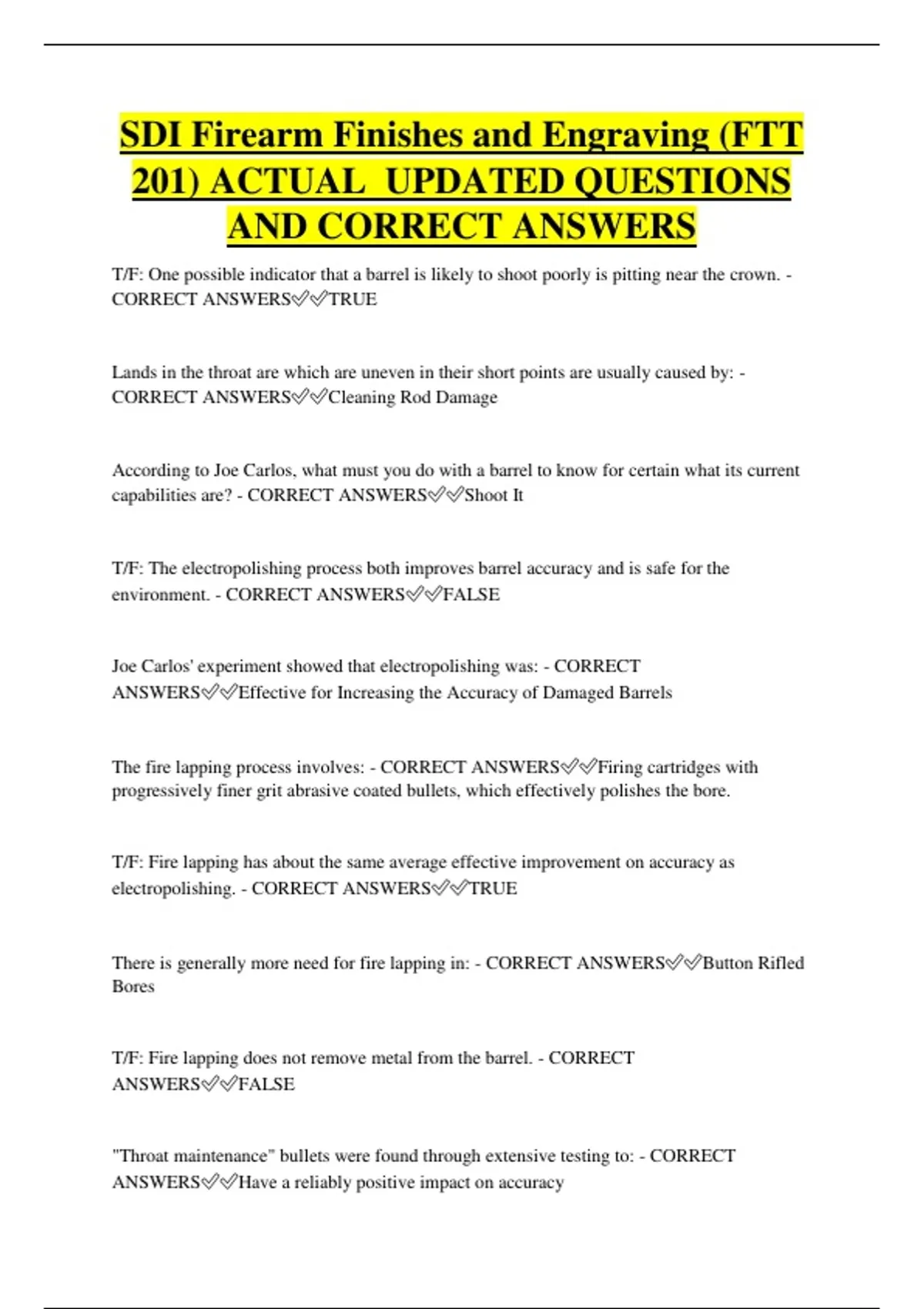 SDI Firearm Finishes and Engraving (FTT 201) ACTUAL UPDATED QUESTIONS AND CORRECT ANSWERS T/F: One possible indicator that a barrel is likely to shoot poorly is pitting near the crown. - CORRECT ANSWERSTRUE Lands in the throat are which are uneven in their short points are usually caused by: - CORRECT ANSWERSCleaning Rod Damage According to Joe Carlos, what must you do with a barrel to know for certain what its current capabilities are? - CORRECT ANSWERSShoot It T/F: The electropolishing process both improves barrel accuracy and is safe for the environment. - CORRECT ANSWERSFALSE Joe Carlos' experiment showed that electropolishing was: - CORRECT ANSWERSEffective for Increasing the Accuracy of Damaged Barrels The fire lapping process involves: - CORRECT ANSWERSFiring cartridges with progressively finer grit abrasive coated bullets, which effectively polishes the bore. T/F: Fire lapping has about the same average effective improvement on accuracy as electropolishing. - CORRECT ANSWERSTRUE There is generally more need for fire lapping in: - CORRECT ANSWERSButton Rifled Bores T/F: Fire lapping does not remove metal from the barrel. - CORRECT ANSWERSFALSE "Throat maintenance" bullets were found through extensive testing to: - CORRECT