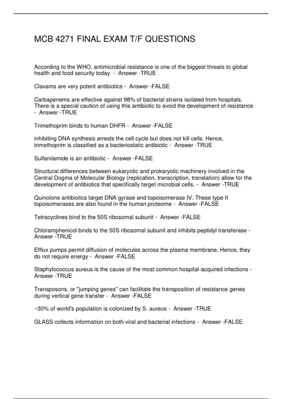 MCB 4271 FINAL EXAM T/ F QUESTIONS