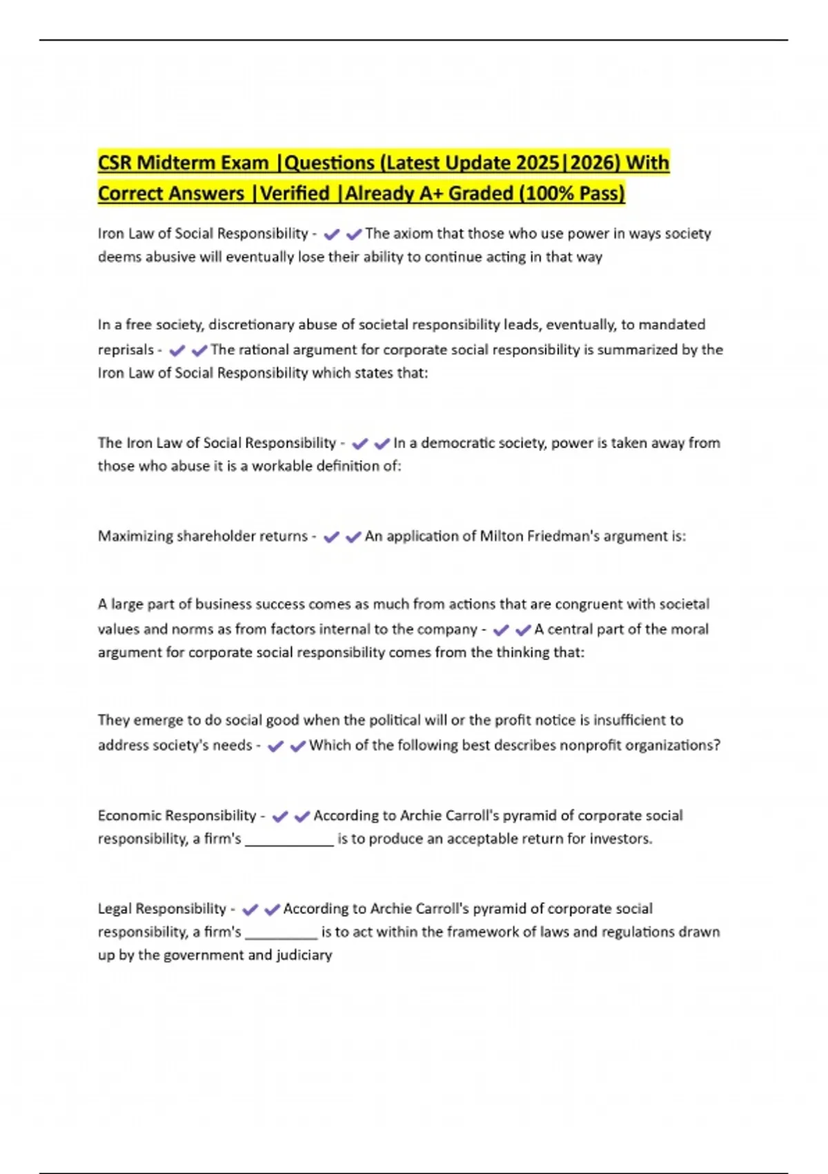 CSR Midterm Exam |Questions (Latest Update 2025|2026) With Correct Answers |Verified |Already A+ Graded (100% Pass)