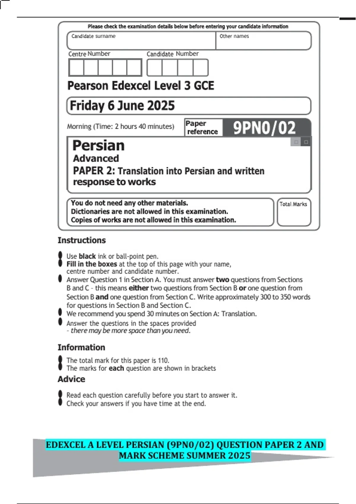 EDEXCEL A LEVEL PERSIAN (9PN0/02) QUESTION PAPER 2 AND MARK SCHEME SUMMER 2025