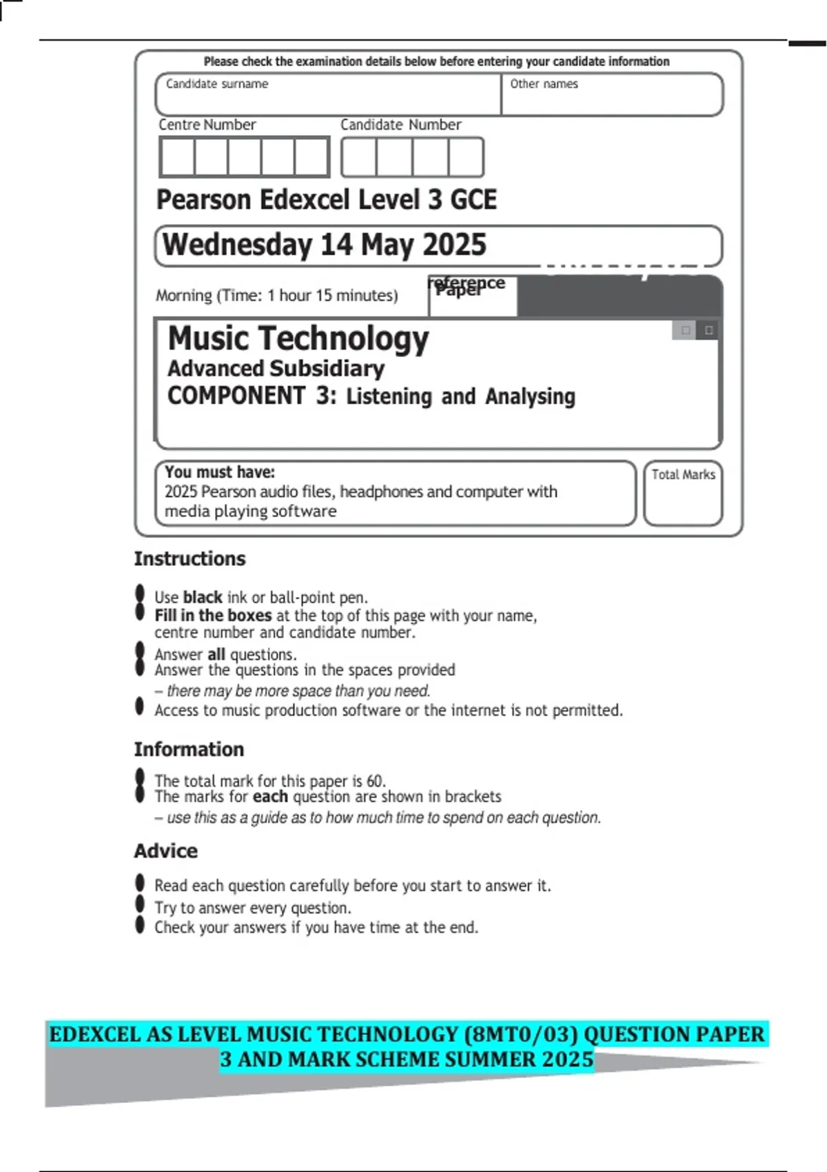 EDEXCEL AS LEVEL MUSIC TECHNOLOGY (8MT0/03) QUESTION PAPER