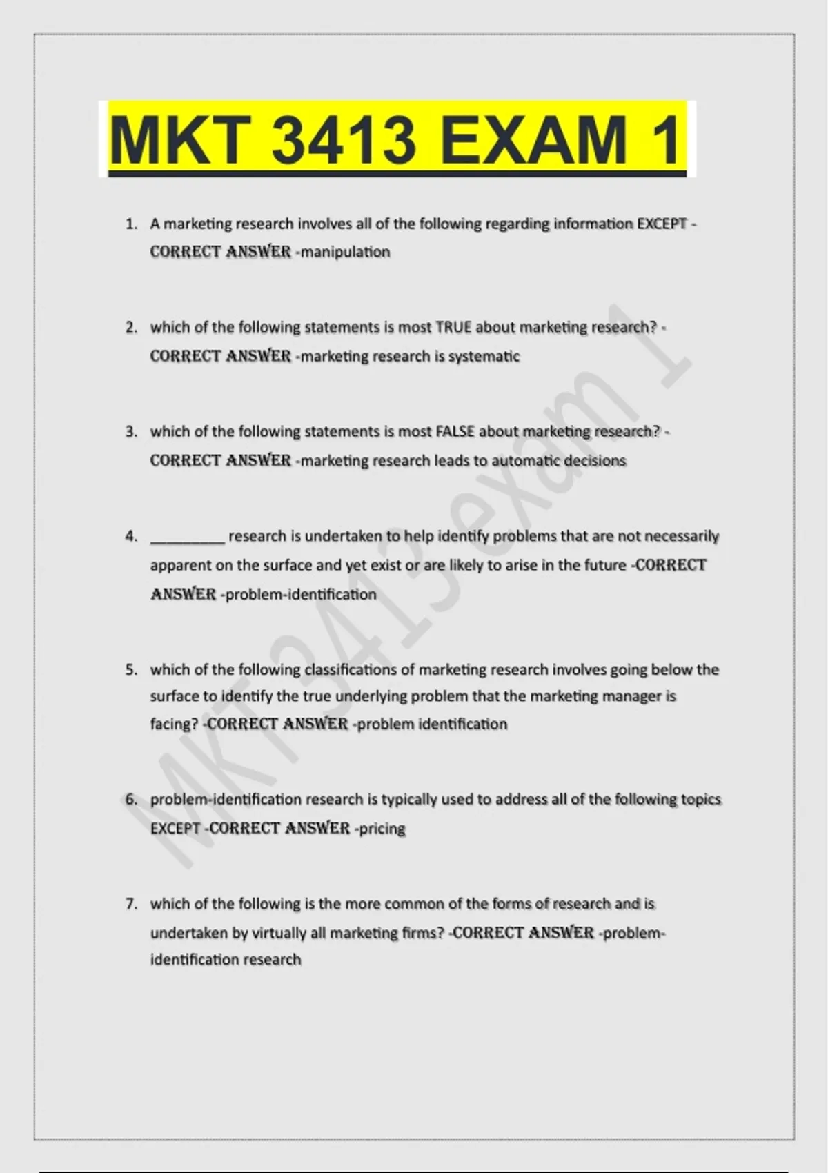 MKT 3413 EXAM 1 1. A marketing research involves all of the following regarding information EXCEPT CORRECT ANSWER-manipulation 2. which of the following statements is most TRUE about marketing research? CORRECT ANSWER-marketing research is systematic 3. which of the following statements is most FALSE about marketing research? CORRECT ANSWER-marketing research leads to automatic decisions 4. _________ research is undertaken to help identify problems that are not necessarily apparent on the surface and yet exist or are likely to arise in the future ANSWER-problem-identification 5. 6. CORRECT which of the following classifications of marketing research involves going below the surface to identify the true underlying problem that the marketing manager is facing? CORRECT ANSWER-problem identification problem-identification research is typically used to address all of the following topics EXCEPT CORRECT ANSWER-pricing 7. which of the following is the more common of the forms of research and is undertaken by virtually all marketing firms? identification research