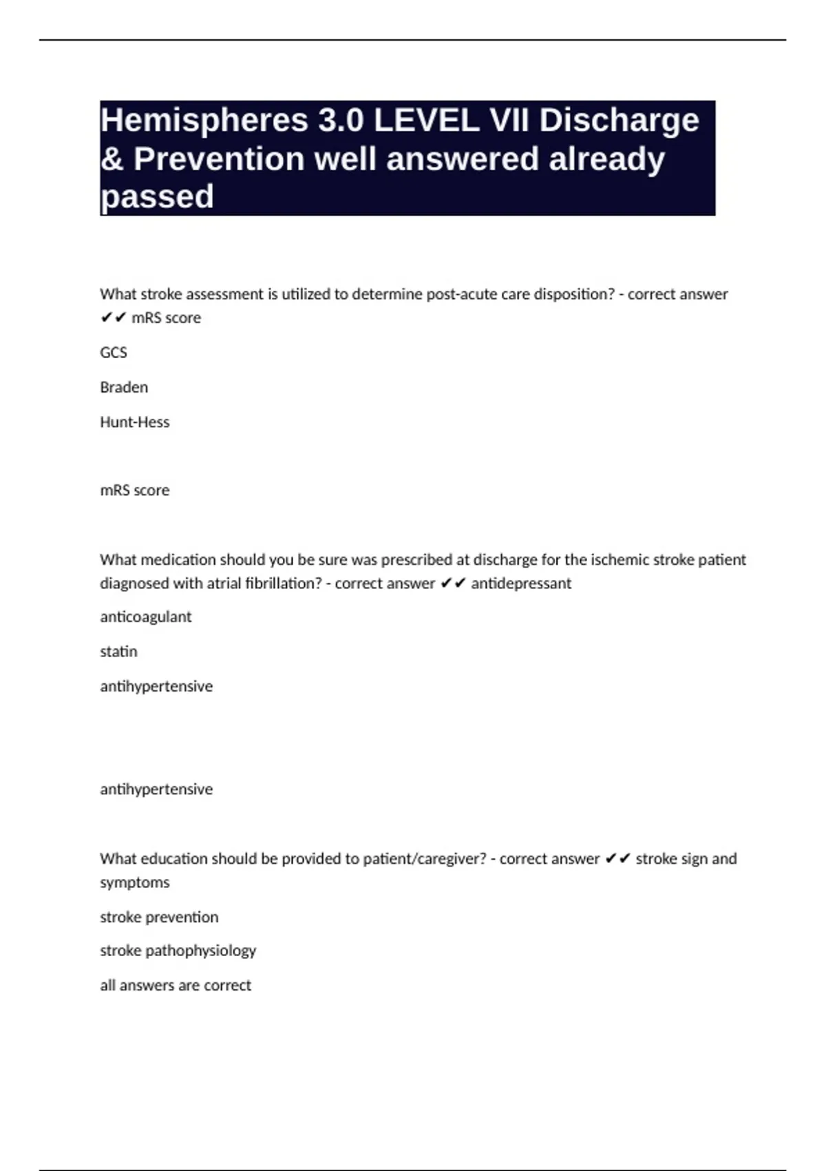 What education should be provided to patient/caregiver? - correct answer ✔✔ stroke sign and
