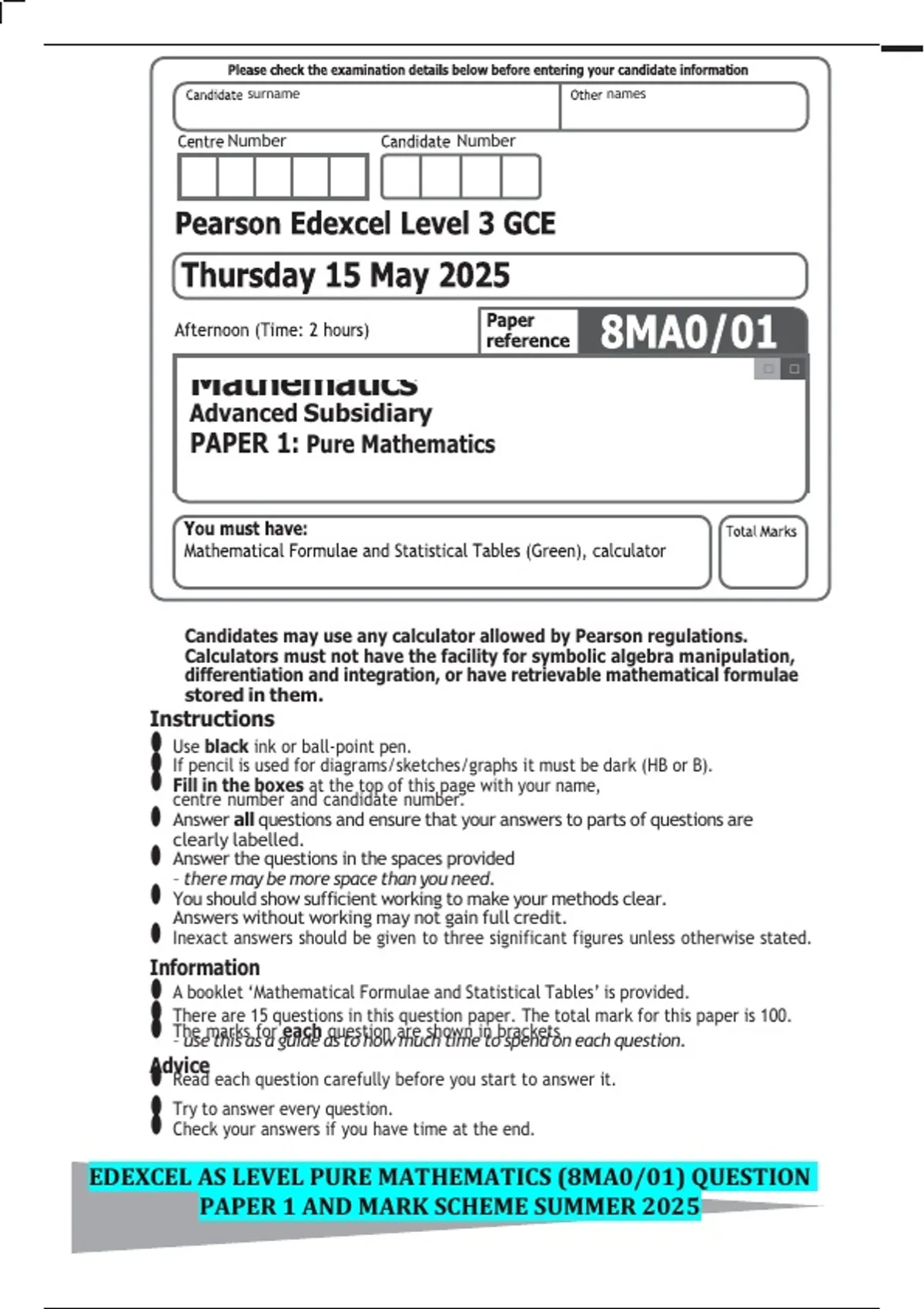 Candidates may use any calculator allowed by Pearson regulations.