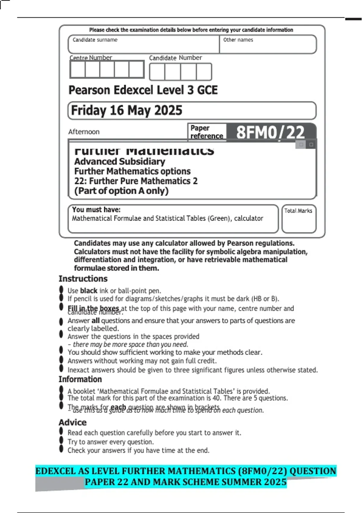 PAPER 22 AND MARK SCHEME SUMMER 2025
