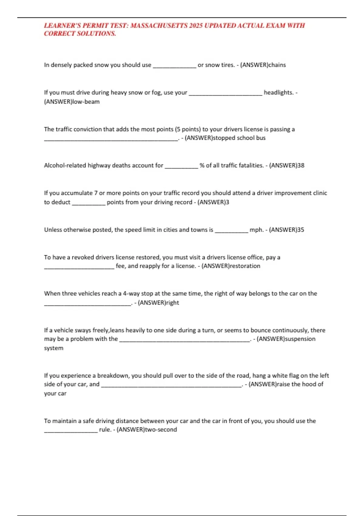 LEARNER'S PERMIT TEST: MASSACHUSETTS 2025 UPDATED ACTUAL EXAM WITH CORRECT SOLUTIONS.