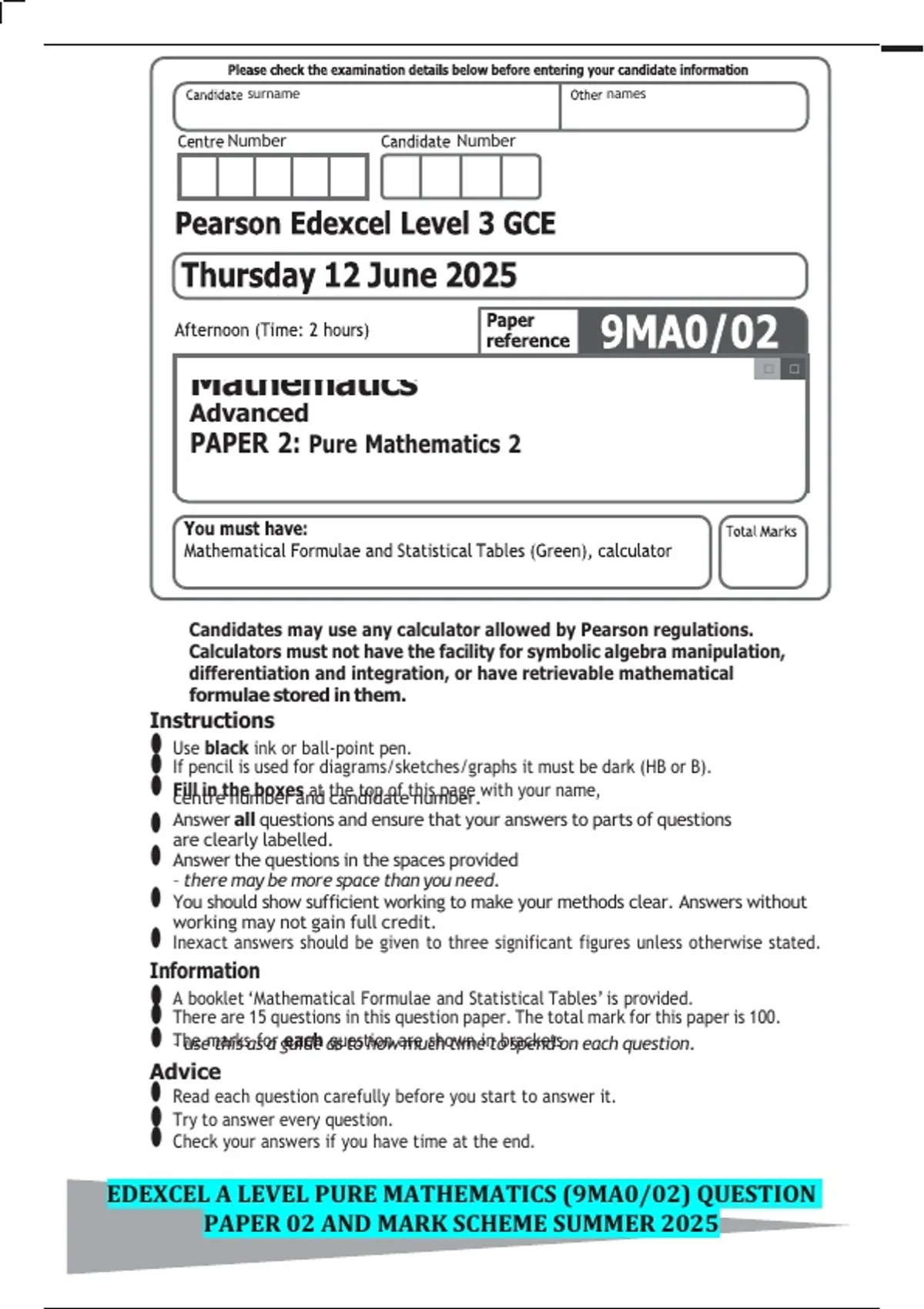 EDEXCEL A LEVEL PURE MATHEMATICS (9MA0/02) QUESTION PAPER 02 AND MARK SCHEME SUMMER 2025