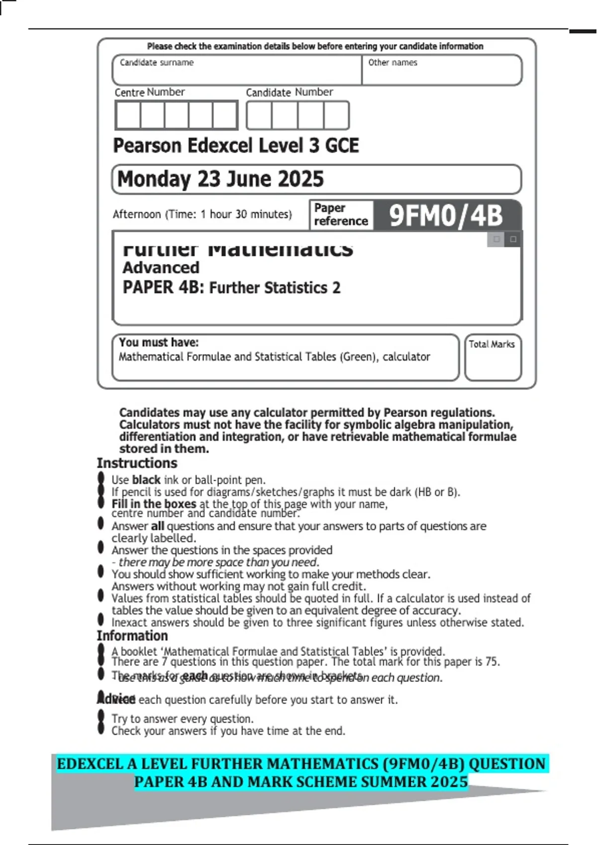 EDEXCEL A LEVEL FURTHER MATHEMATICS (9FM0/4B) QUESTION PAPER 4B AND MARK SCHEME SUMMER 2025