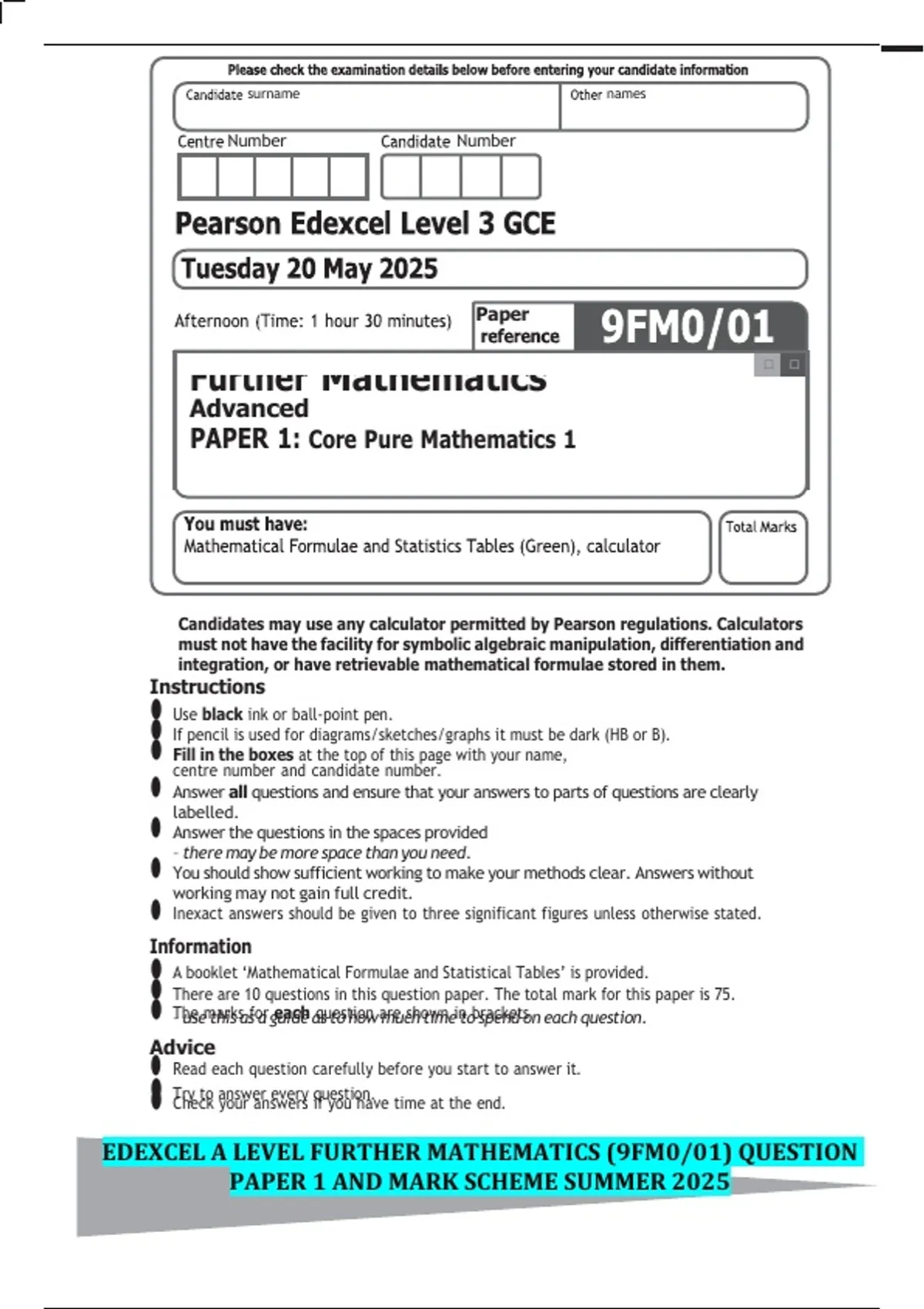 EDEXCEL A LEVEL FURTHER MATHEMATICS (9FM0/01) QUESTION