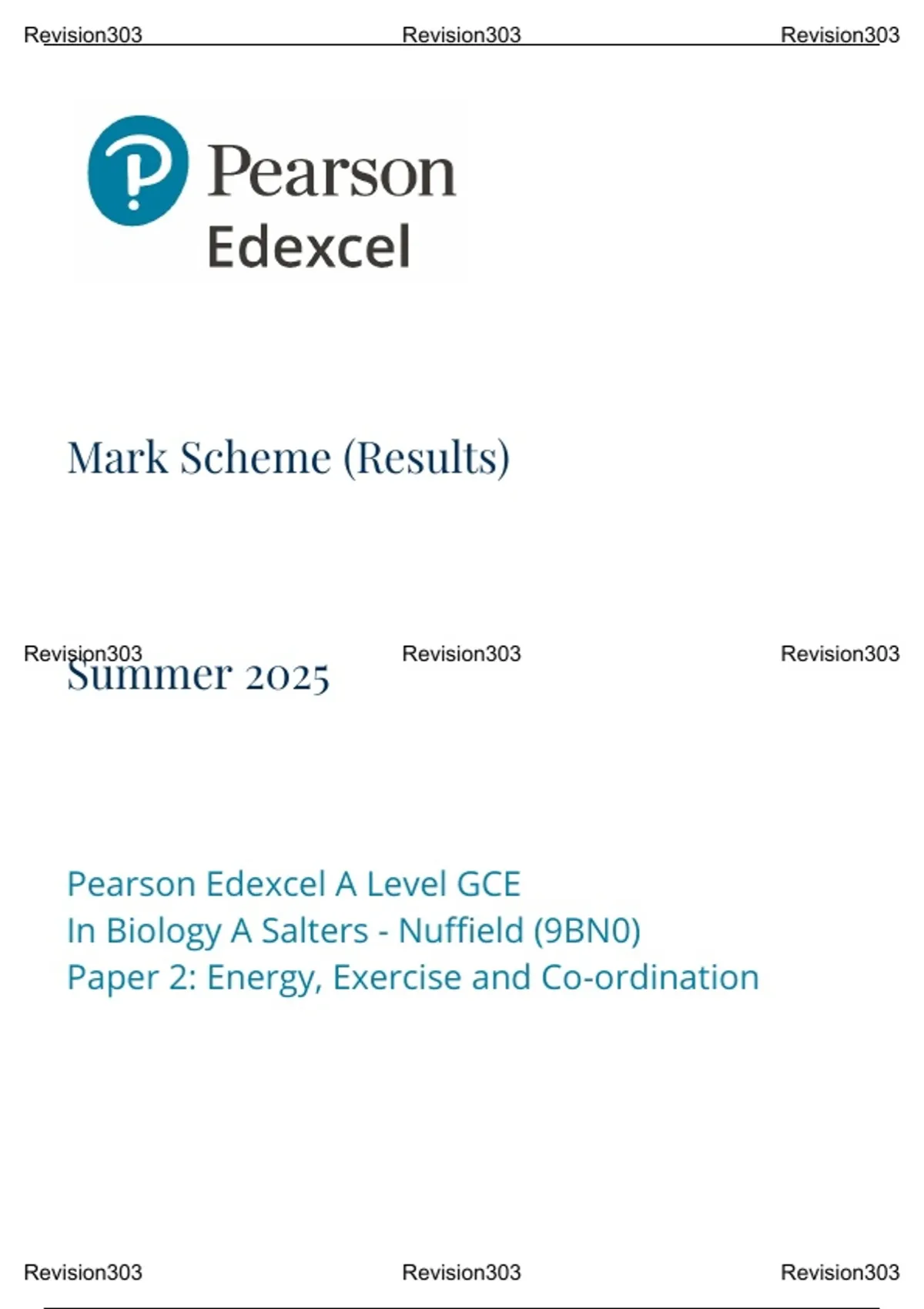 A-Level Edexcel 2025 Biology A Paper 2 Mark Scheme Paper 2: Energy, Exercise and Co-ordination