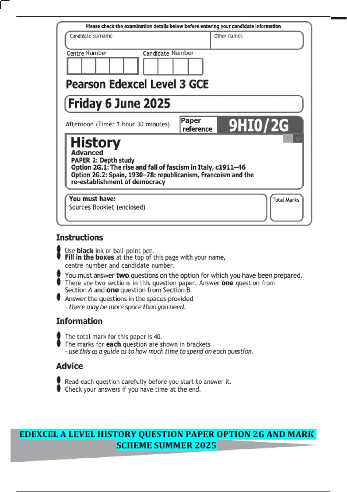 EDEXCEL A LEVEL HISTORY QUESTION PAPER OPTION 2G AND MARK