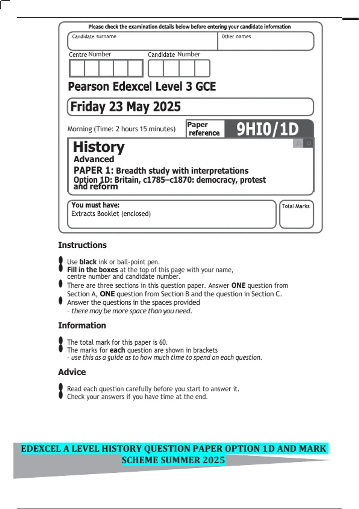Mark Scheme (Results) Summer 2025 GCE History (9HI0/1D) Advanced Paper 1: Breadth study with interpretations 1D: Britain, c1785-c1870: democracy, protest and reform