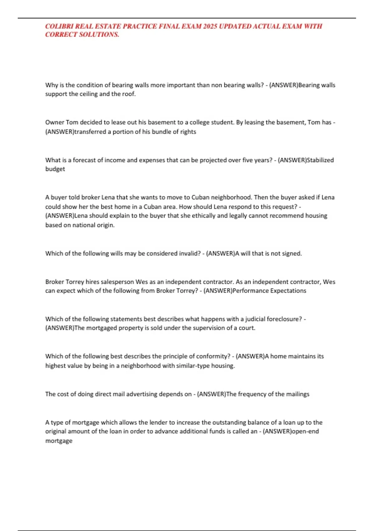 COLIBRI REAL ESTATE PRACTICE FINAL EXAM 2025 UPDATED ACTUAL EXAM WITH