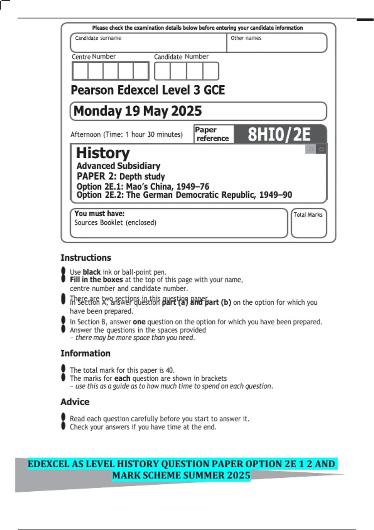 Mark Scheme (Results) Summer 2025 Pearson Edexcel In GCE History (8HI0/2E) Advanced Subsidiary Paper 2: Depth study Option 2E.1: Mao’s China, 1949–76 Option 2E.2: The German Democratic Republic, 1949–90