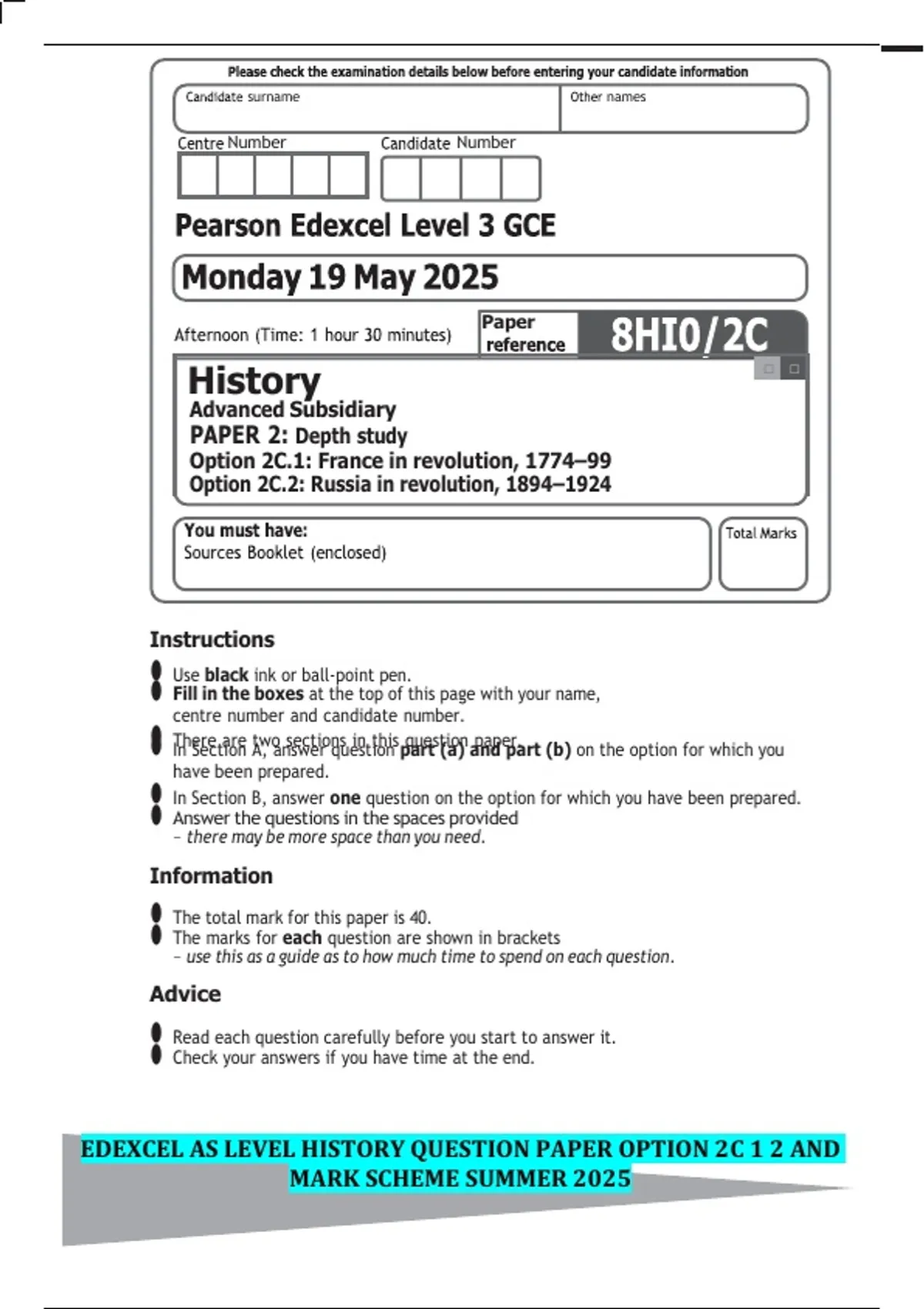 EDEXCEL AS LEVEL HISTORY QUESTION PAPER OPTION 2C 1 2 AND