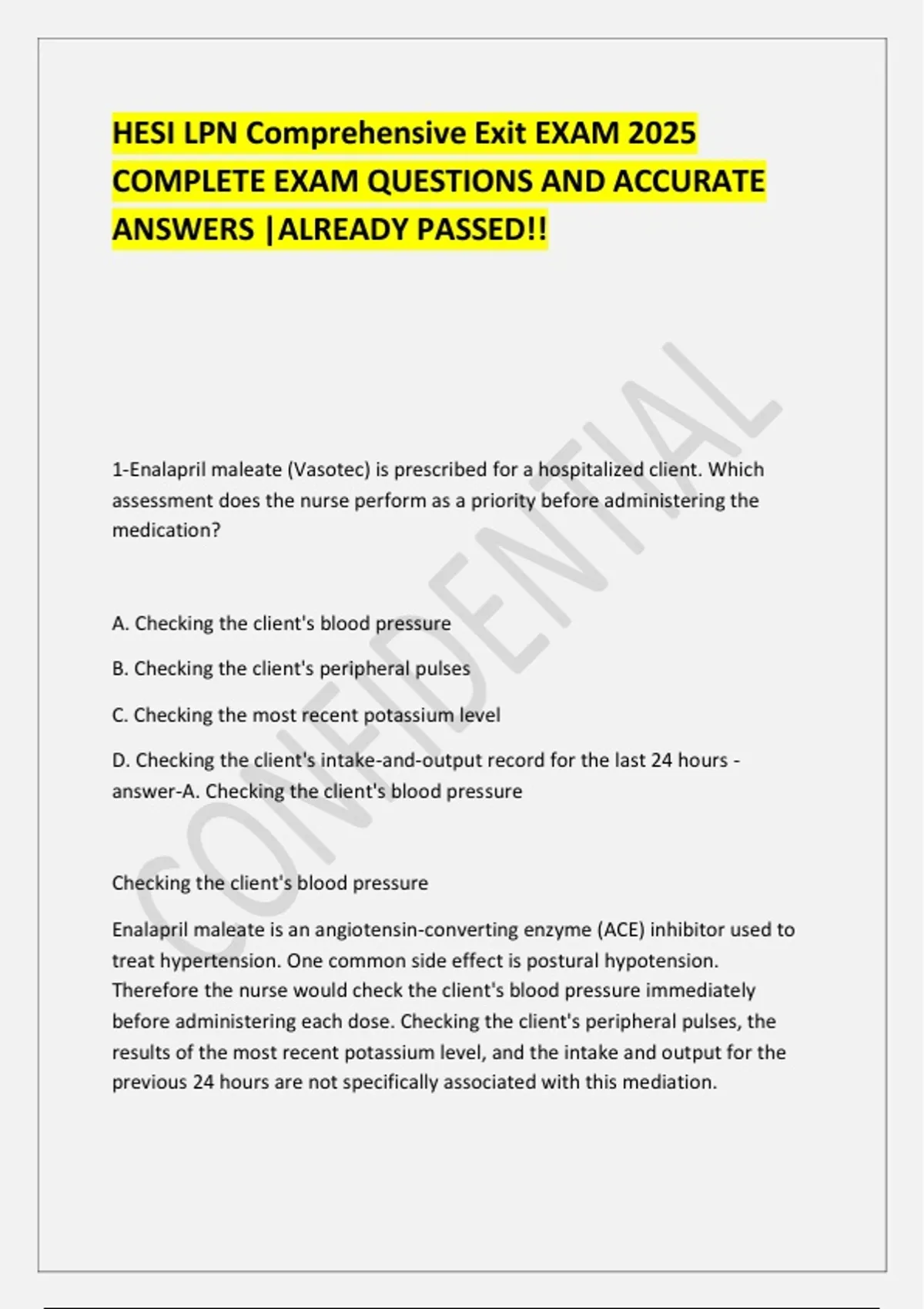 1-Enalapril maleate (Vasotec) is prescribed for a hospitalized client. Which