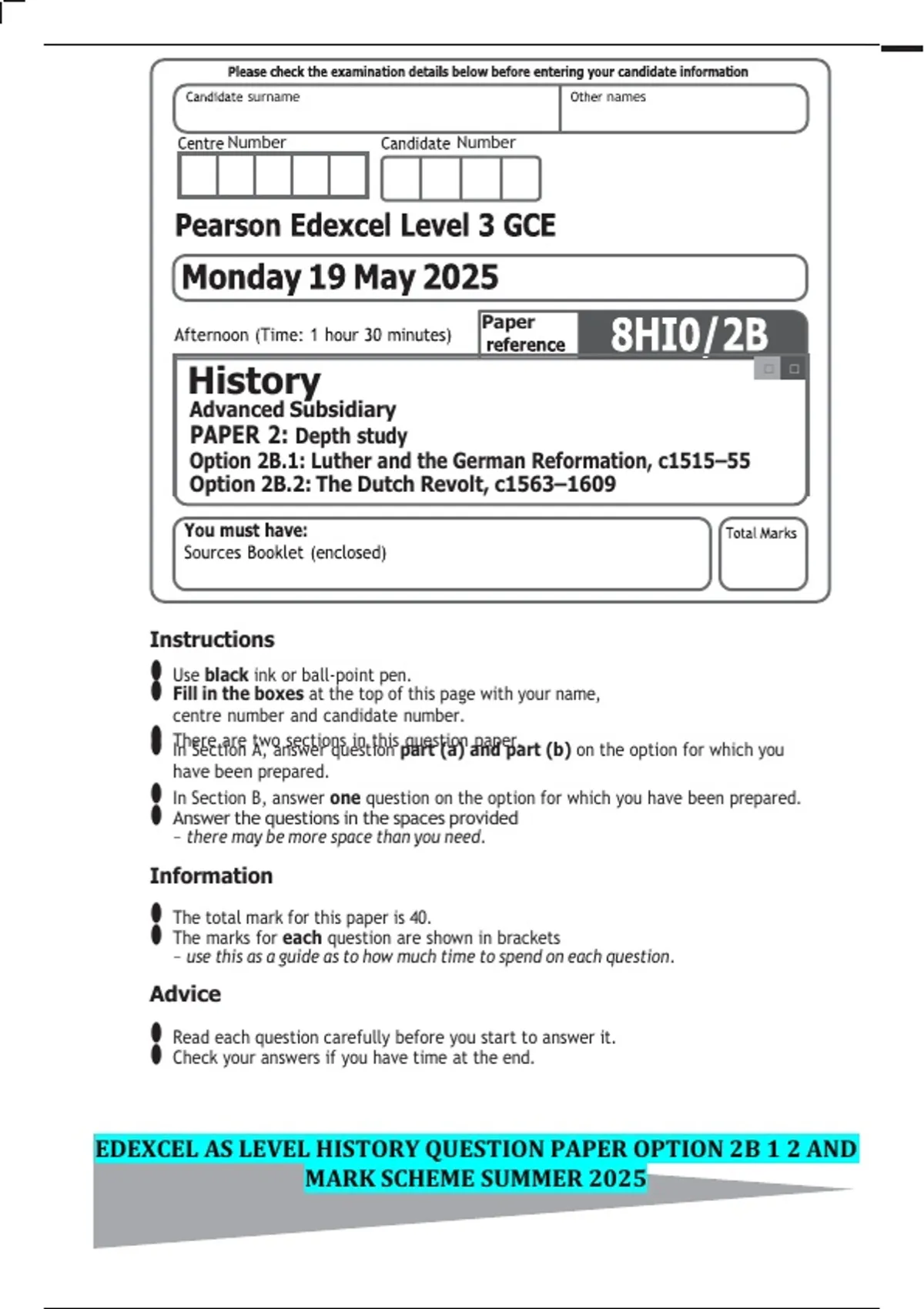 EDEXCEL AS LEVEL HISTORY QUESTION PAPER OPTION 2B 1 2 AND