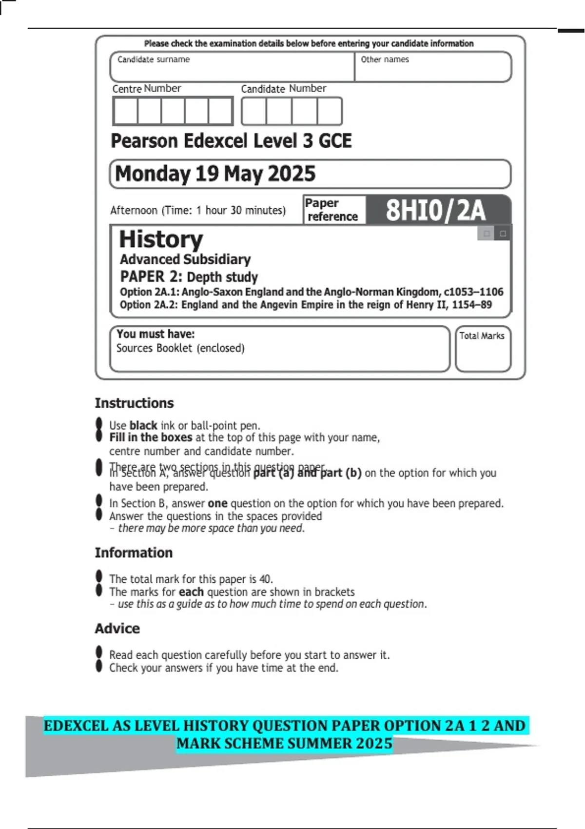 Mark Scheme (Pre-Standardisation) Summer 2025 Pearson Edexcel In GCE History (8HI0/2A) Advanced Subsidiary Paper 2: Depth study Option 2A.1: Anglo-Saxon England and the Anglo-Norman Kingdom, c1053–1106 Option 2A.2: England and the Angevin Empire in the reign of Henry II, 1154–89