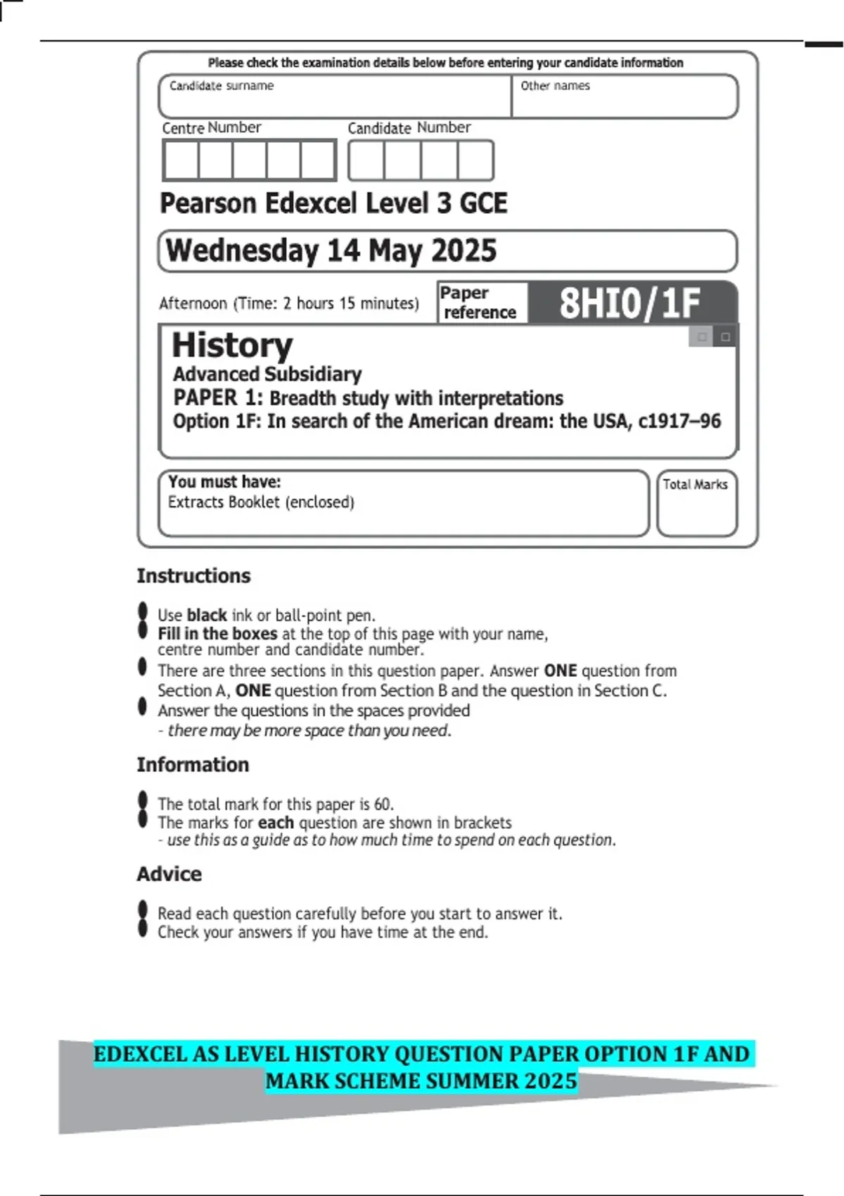 EDEXCEL AS LEVEL HISTORY QUESTION PAPER OPTION 1F AND