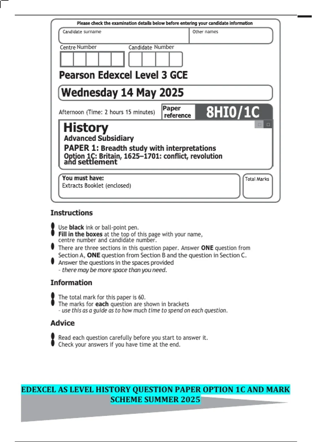 Mark Scheme (Results) Summer 2025 Pearson Edexcel In GCE History (8HI0/1C) Advanced Subsidiary Paper 1: Breadth study with interpretations Option 1C: Britain, : conflict, revolution and settlement