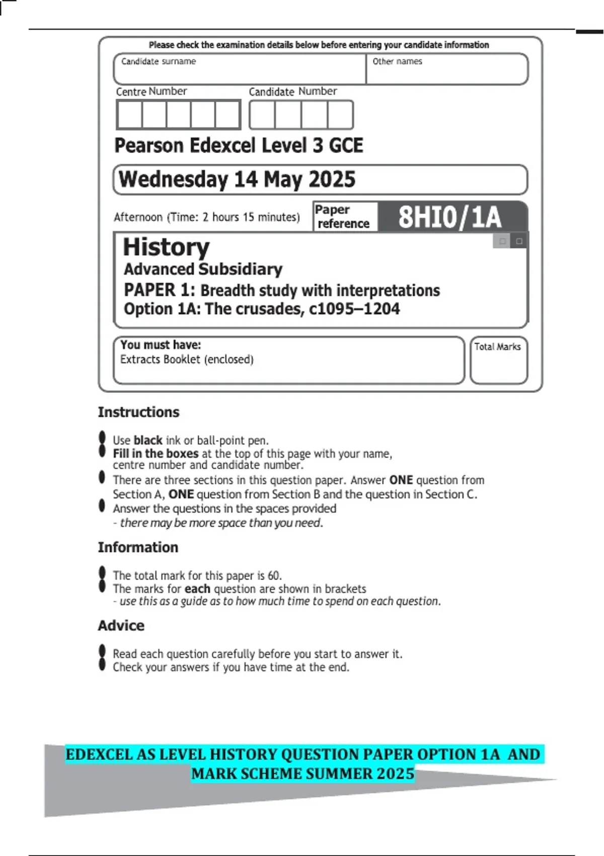 EDEXCEL AS LEVEL HISTORY QUESTION PAPER OPTION 1A AND