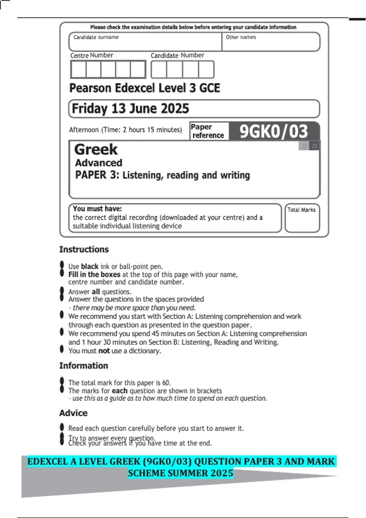 Mark Scheme (Results) Summer 2025 Pearson Edexcel GCE In Greek (9GK0) Paper 03 Listening, reading and writing in Greek