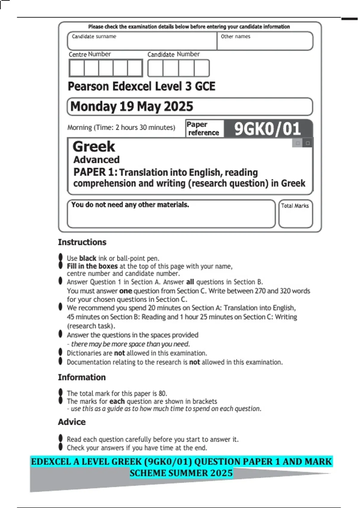 EDEXCEL A LEVEL GREEK (9GK0/01) QUESTION PAPER 1 AND MARK SCHEME SUMMER 2025