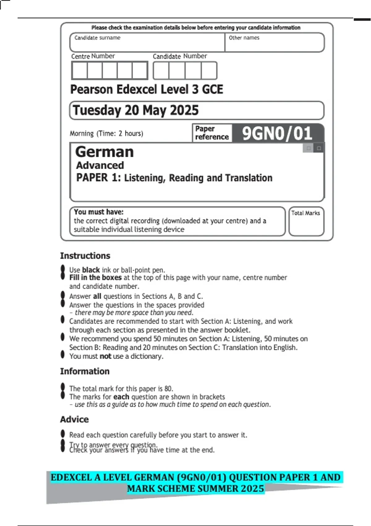 EDEXCEL A LEVEL GERMAN (9GN0/01) QUESTION PAPER 1 AND