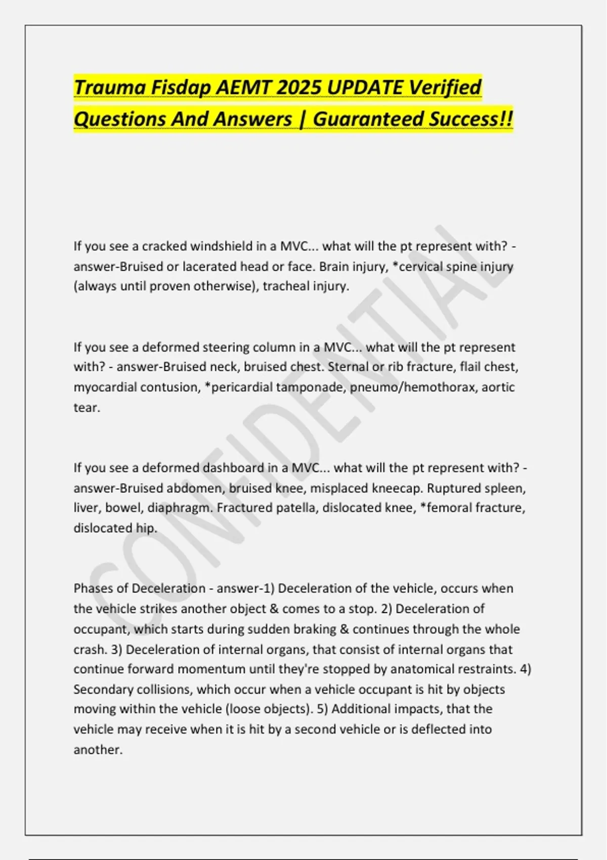 If you see a cracked windshield in a MVC... what will the pt represent with? - answer-Bruised or lacerated head or face. Brain injury, *cervical spine injury (always until proven otherwise), tracheal injury. If you see a deformed steering column in a MVC... what will the pt represent with? - answer-Bruised neck, bruised chest. Sternal or rib fracture, flail chest, myocardial contusion, *pericardial tamponade, pneumo/hemothorax, aortic tear. If you see a deformed dashboard in a MVC... what will the pt represent with? - answer-Bruised abdomen, bruised knee, misplaced kneecap. Ruptured spleen, liver, bowel, diaphragm. Fractured patella, dislocated knee, *femoral fracture, dislocated hip. Phases of Deceleration - answer-1) Deceleration of the vehicle, occurs when the vehicle strikes another object & comes to a stop. 2) Deceleration of occupant, which starts during sudden braking & continues through the whole crash. 3) Deceleration of internal organs, that consist of internal organs that continue forward momentum until they're stopped by anatomical restraints. 4) Secondary collisions, which occur when a vehicle occupant is hit by objects moving within the vehicle (loose objects). 5) Additional impacts, that the vehicle may receive when it is hit by a second vehicle or is deflected into another. Seat Belt Use - answer-All arguments against seat belt use are unfounded.