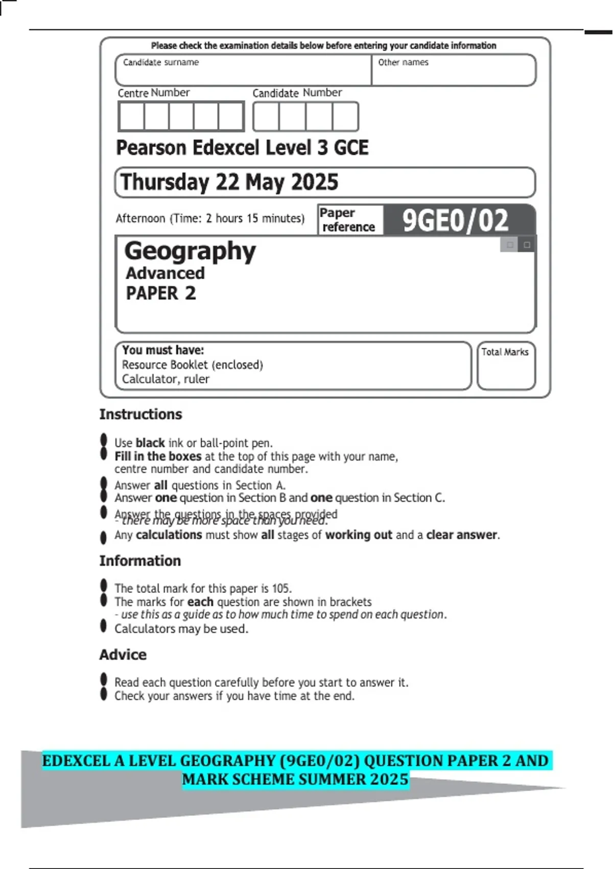 EDEXCEL A LEVEL GEOGRAPHY (9GE0/02) QUESTION PAPER 2 AND