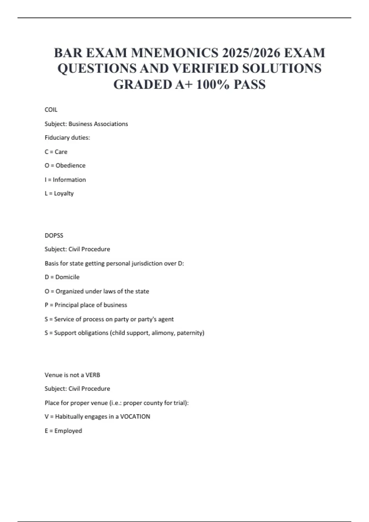 BAR EXAM MNEMONICS 2025/2026 EXAM