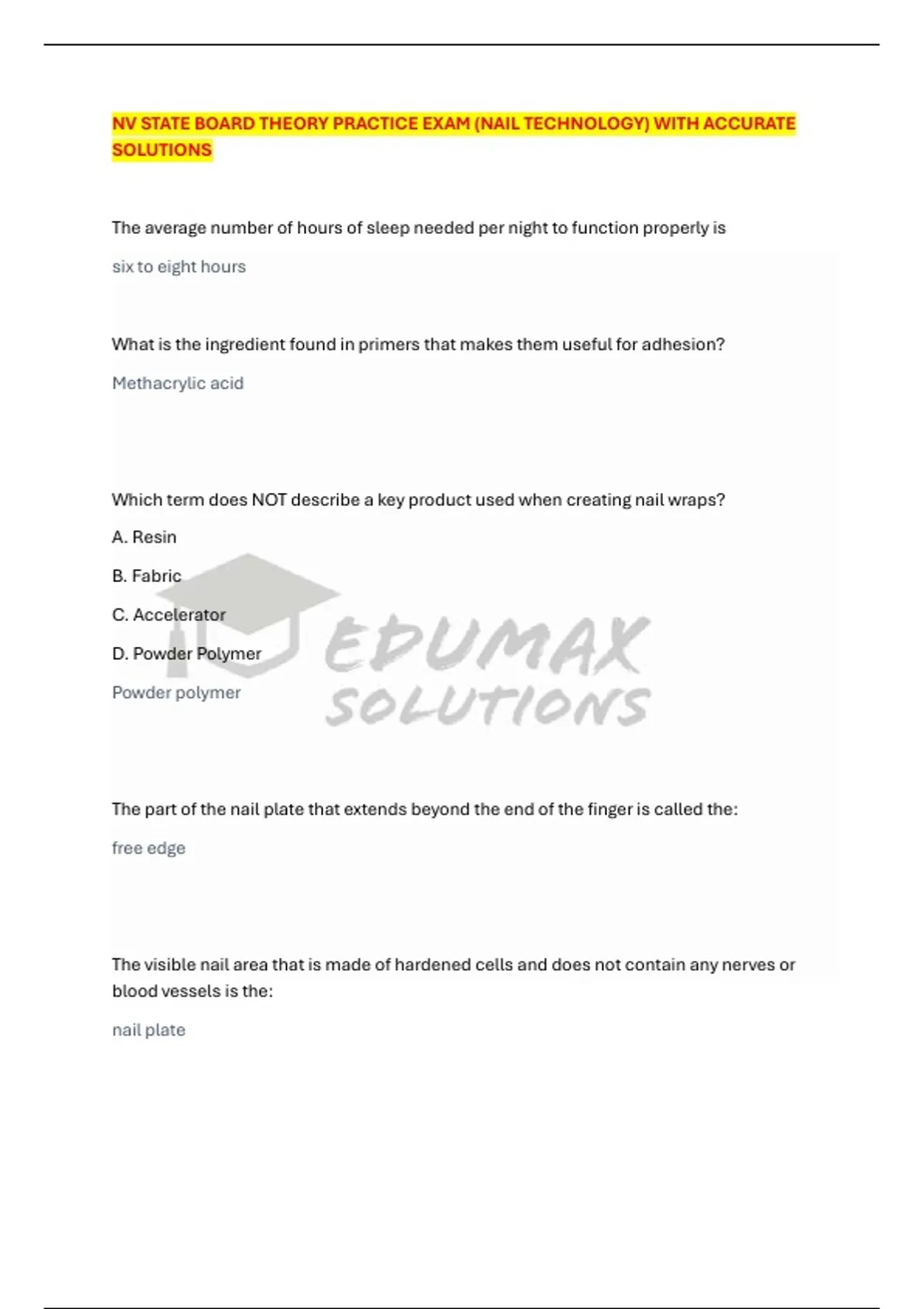 NV STATE BOARD THEORY PRACTICE EXAM (NAIL TECHNOLOGY) WITH ACCURATE
