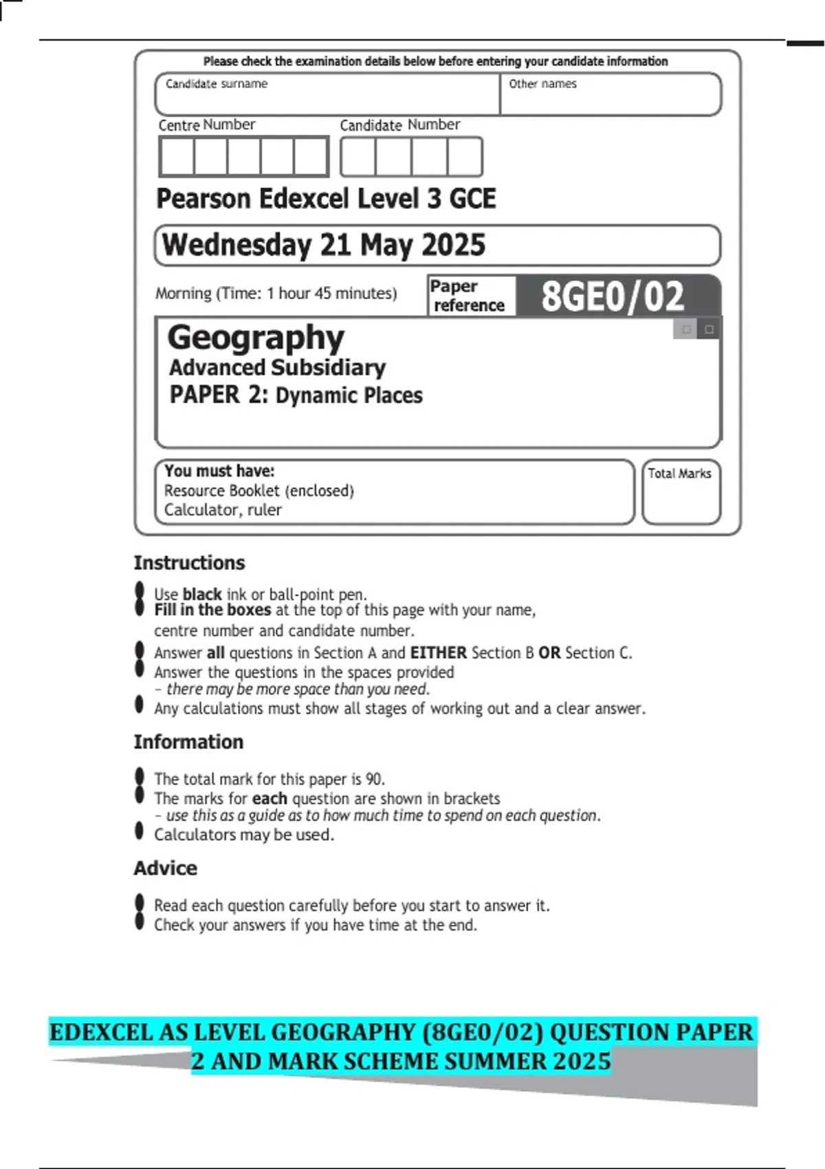 EDEXCEL AS LEVEL GEOGRAPHY (8GE0/02) QUESTION PAPER 2 AND MARK SCHEME SUMMER 2025