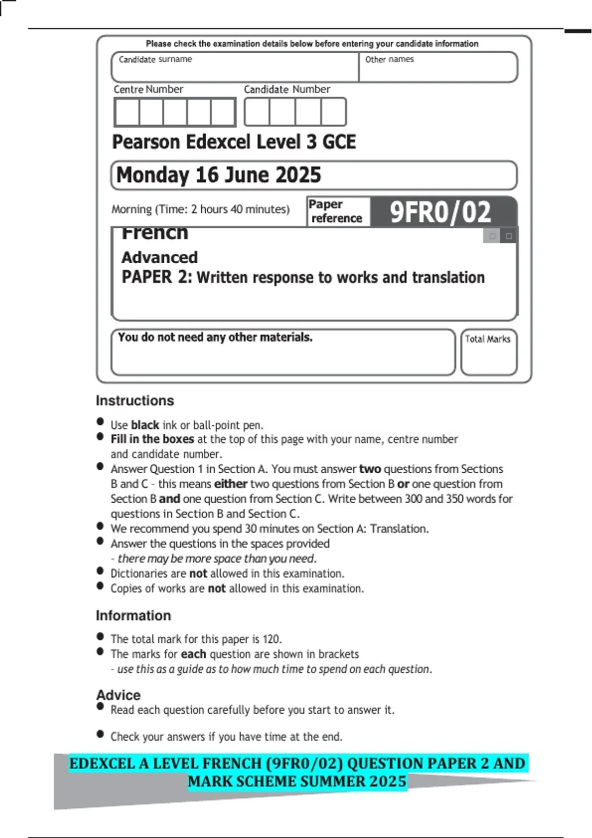 EDEXCEL A LEVEL FRENCH (9FR0/02) QUESTION PAPER 2 AND MARK SCHEME SUMMER 2025