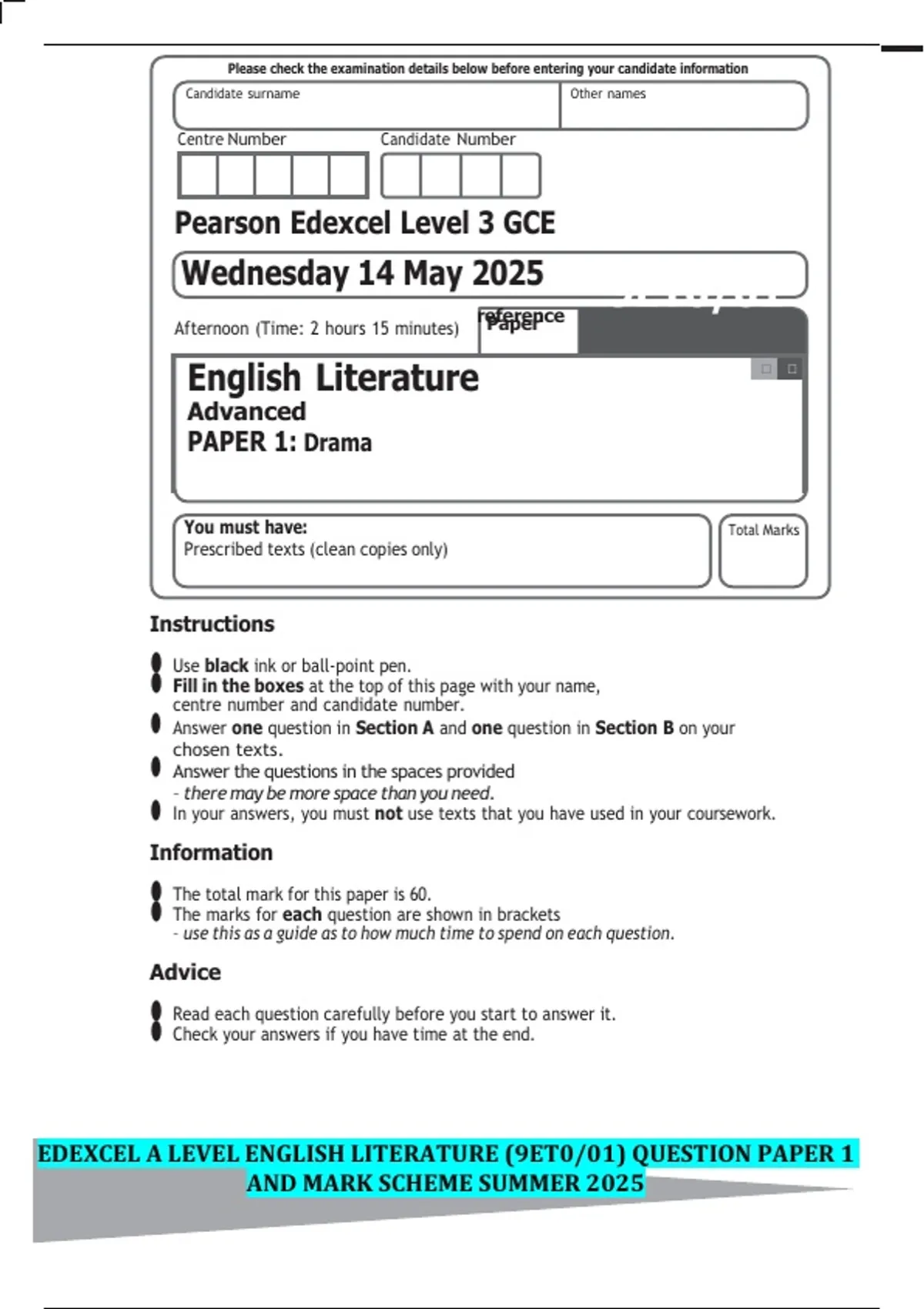 EDEXCEL A LEVEL ENGLISH LITERATURE (9ET0/01) QUESTION PAPER 1