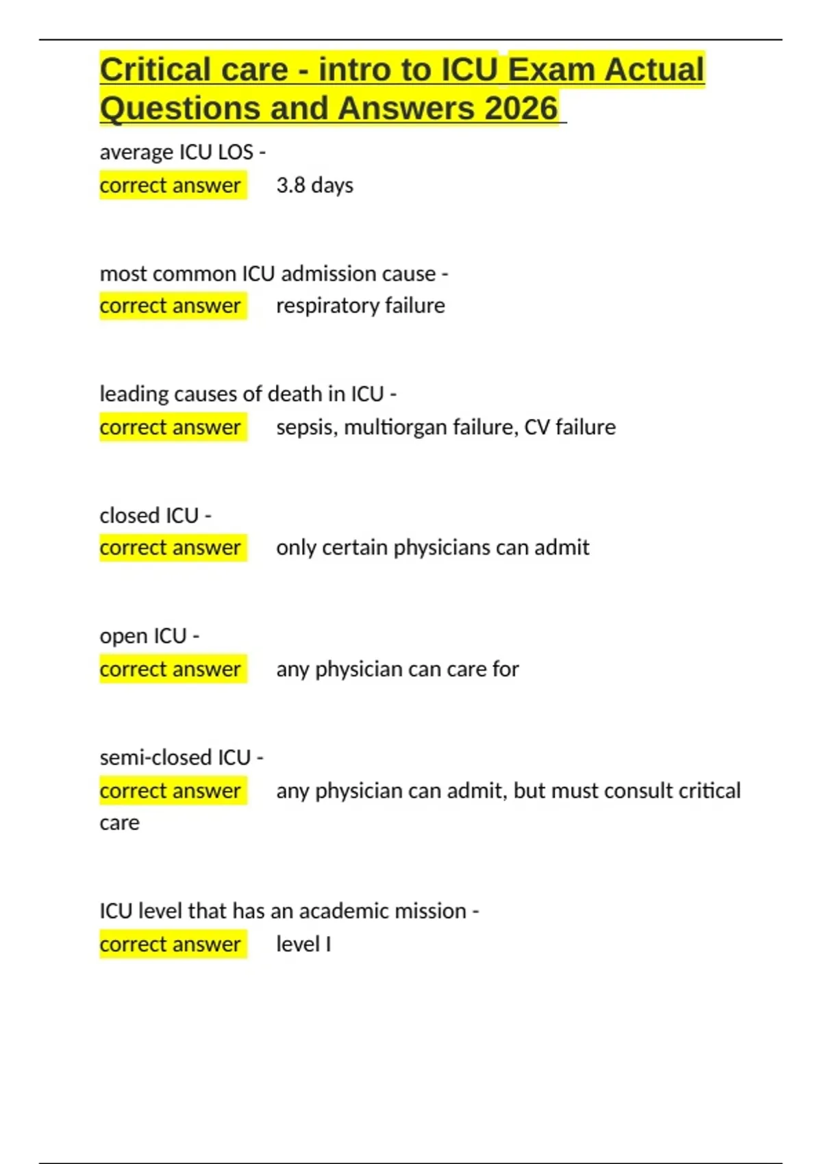 Critical care - intro to ICU Exam Actual