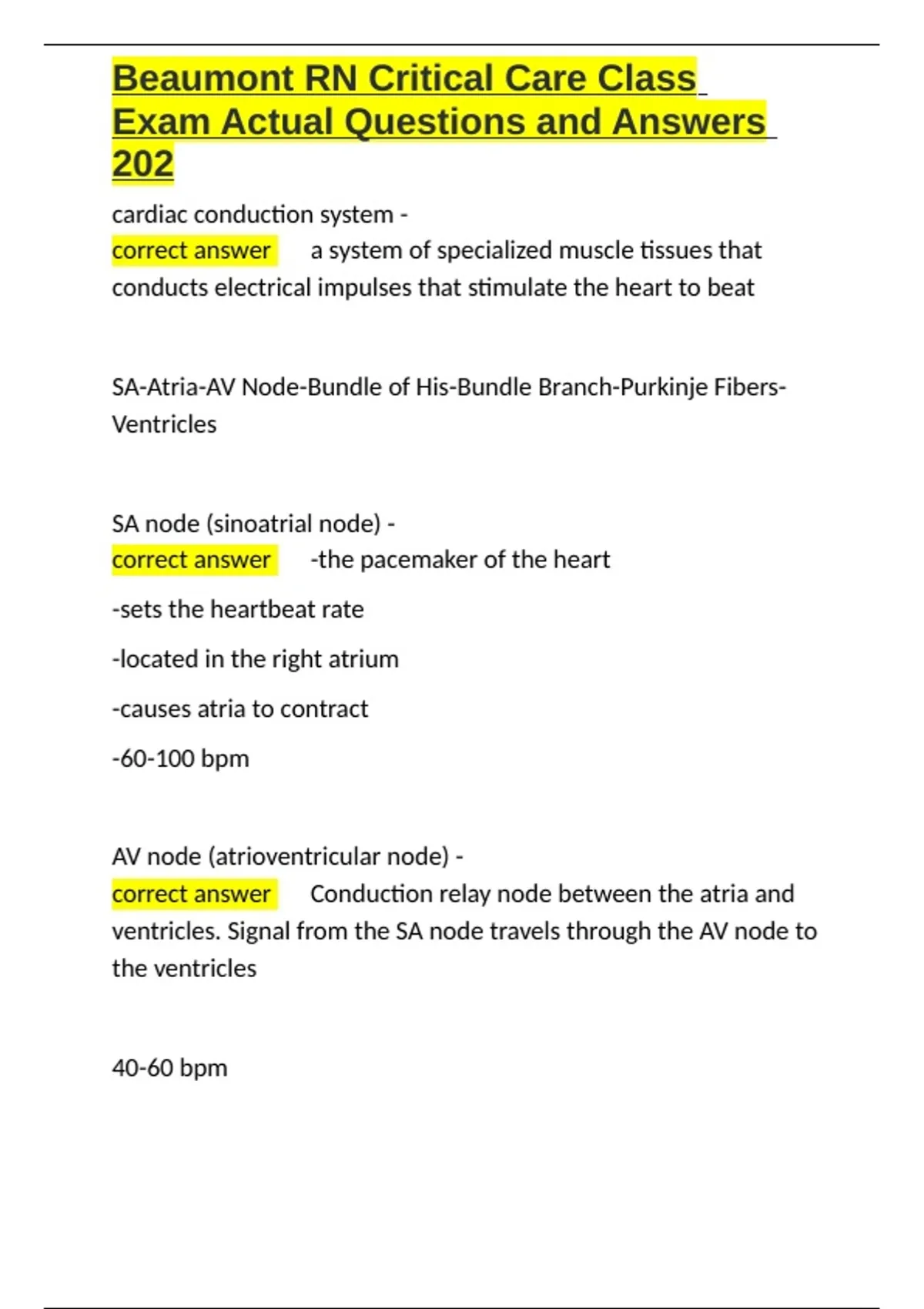 Beaumont RN Critical Care Class Exam Actual Questions and Answers