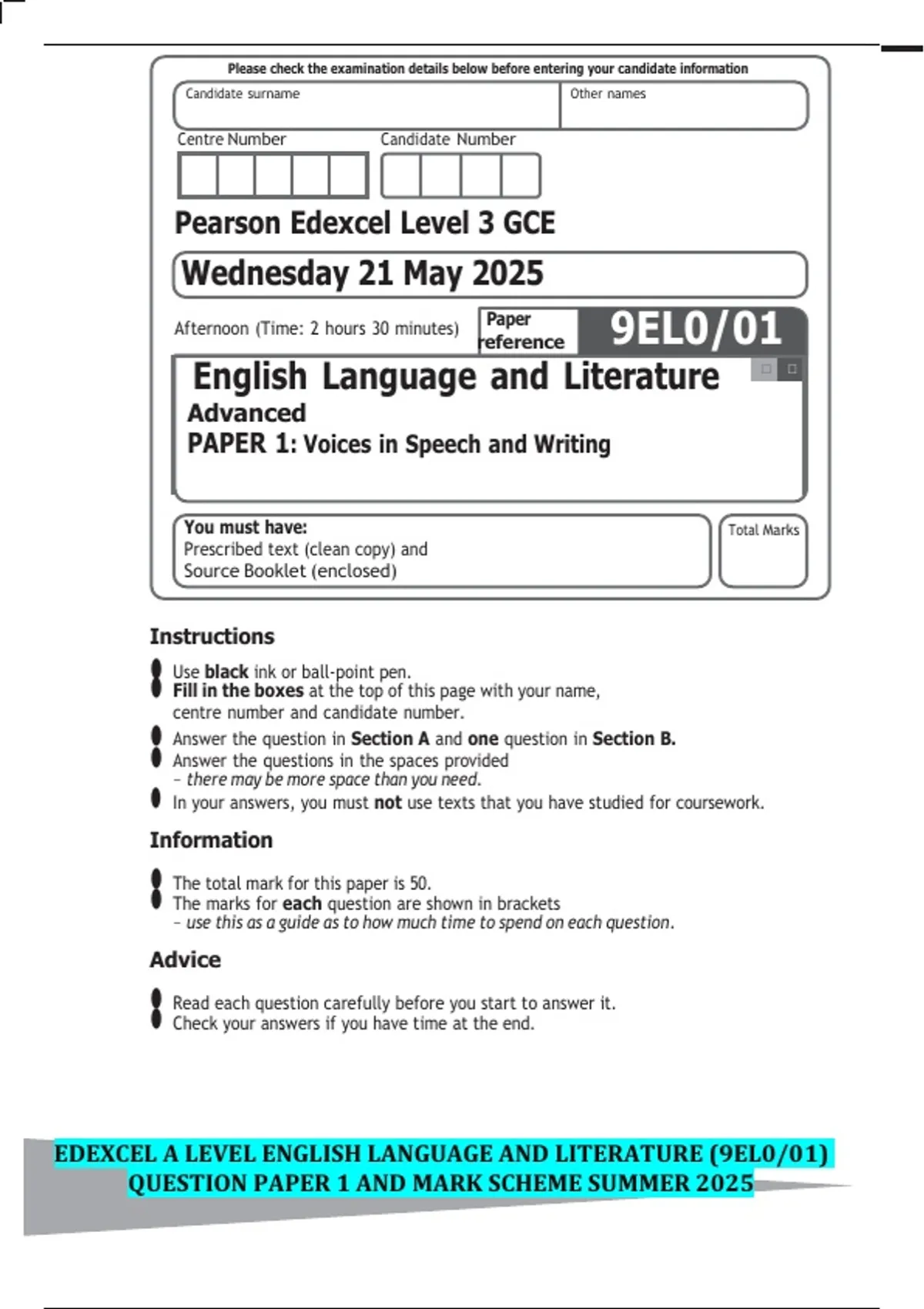 EDEXCEL A LEVEL ENGLISH LANGUAGE AND LITERATURE (9EL0/01)