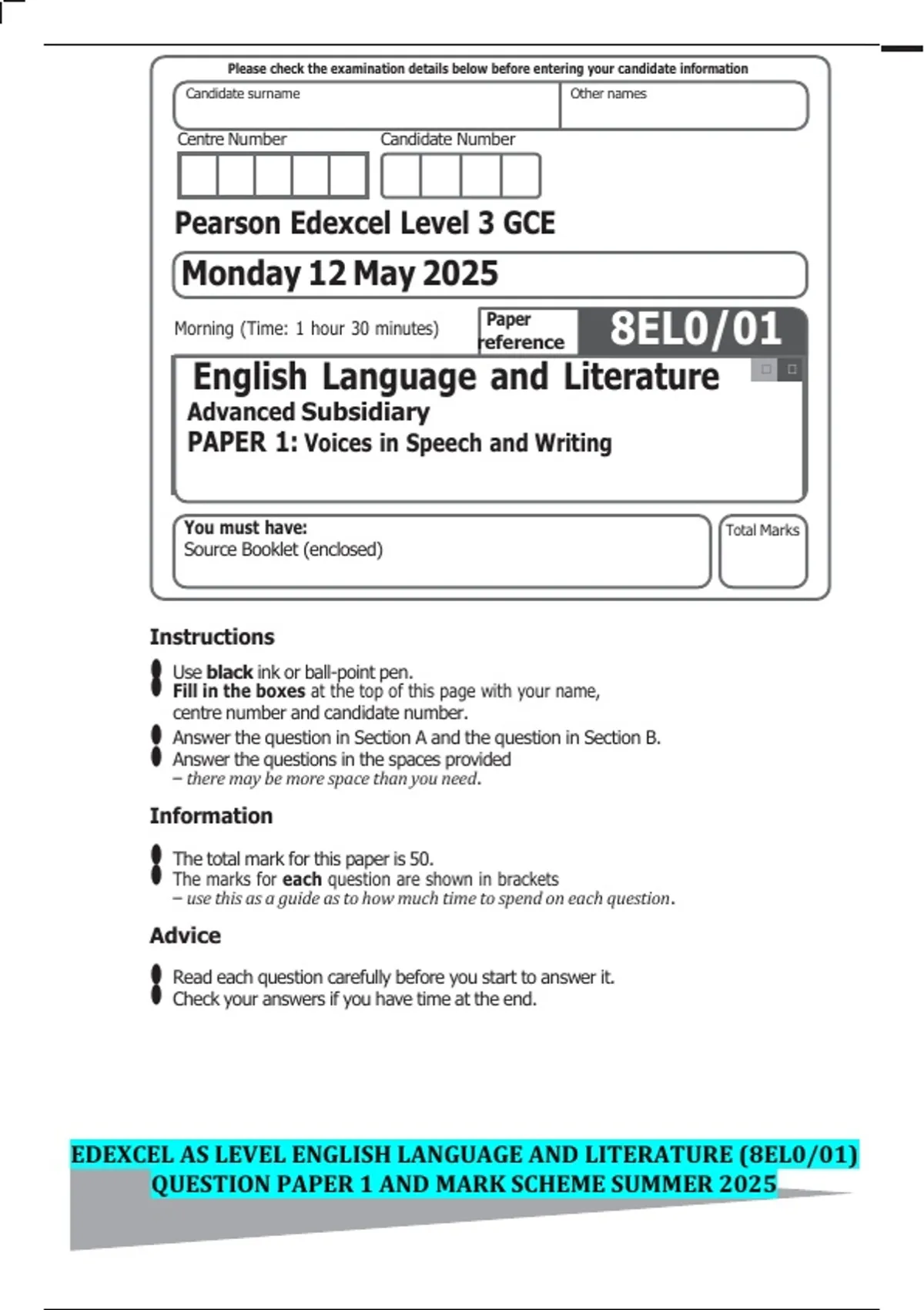 EDEXCEL AS LEVEL ENGLISH LANGUAGE AND LITERATURE (8EL0/01)
