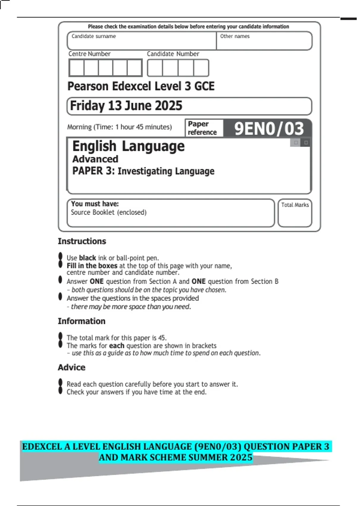 EDEXCEL A LEVEL ENGLISH LANGUAGE (9EN0/03) QUESTION PAPER 3 AND MARK SCHEME SUMMER 2025