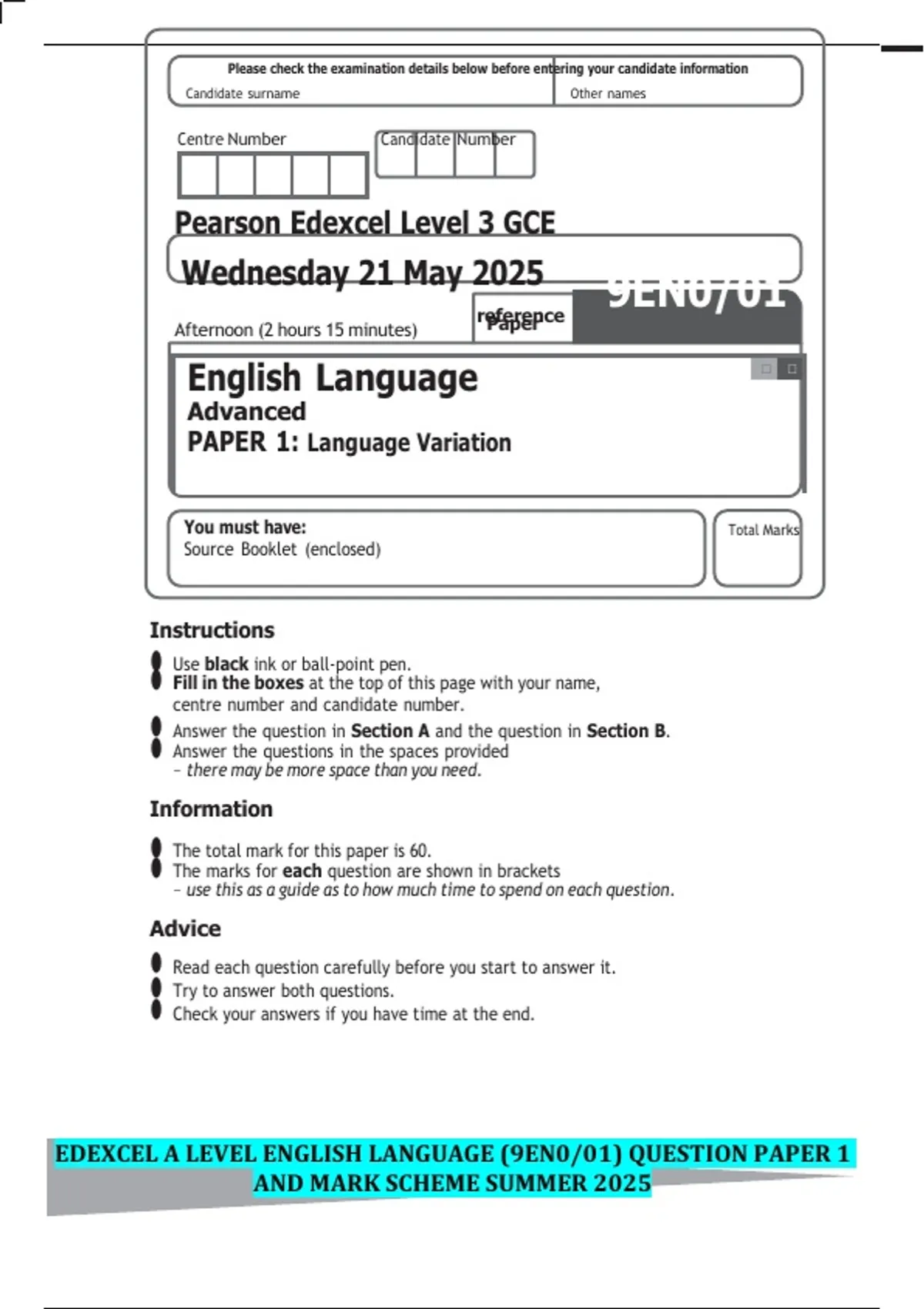 EDEXCEL A LEVEL ENGLISH LANGUAGE (9EN0/01) QUESTION PAPER 1 AND MARK SCHEME SUMMER 2025