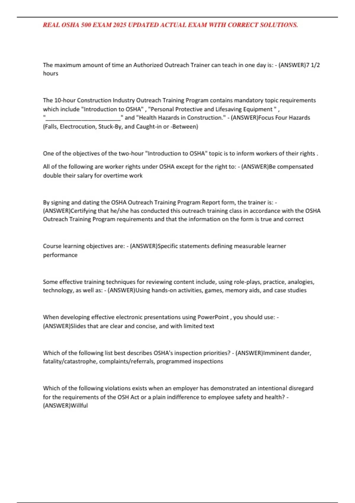 , REAL OSHA 500 EXAM 2025 UPDATED ACTUAL EXAM WITH CORRECT SOLUTIONS.