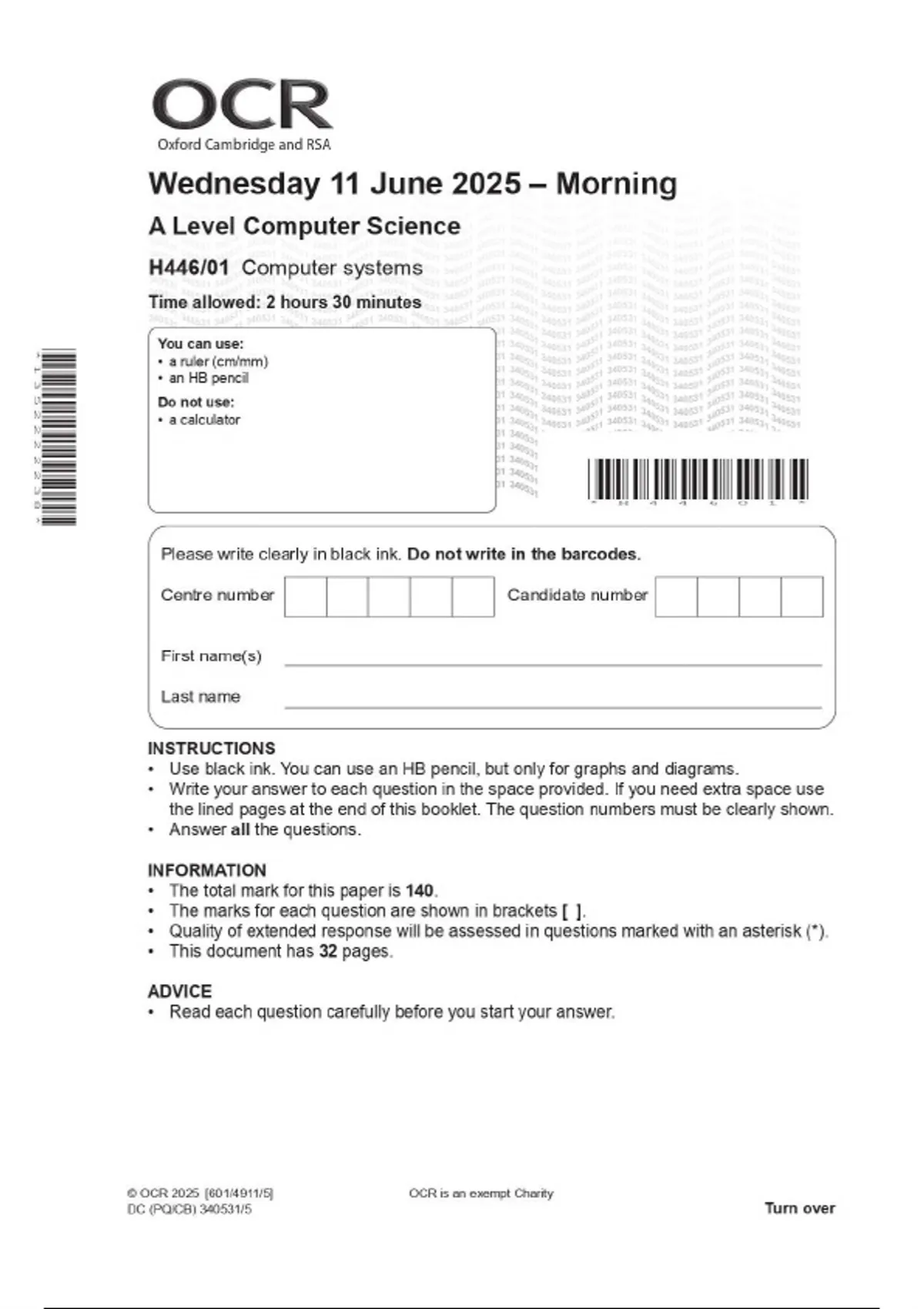 A LEVEL COMPUTER SCIENCE (H446/01) COMPUTER SYSTEMS JUNE 2025 PAPER 1 QUESTION PAPER