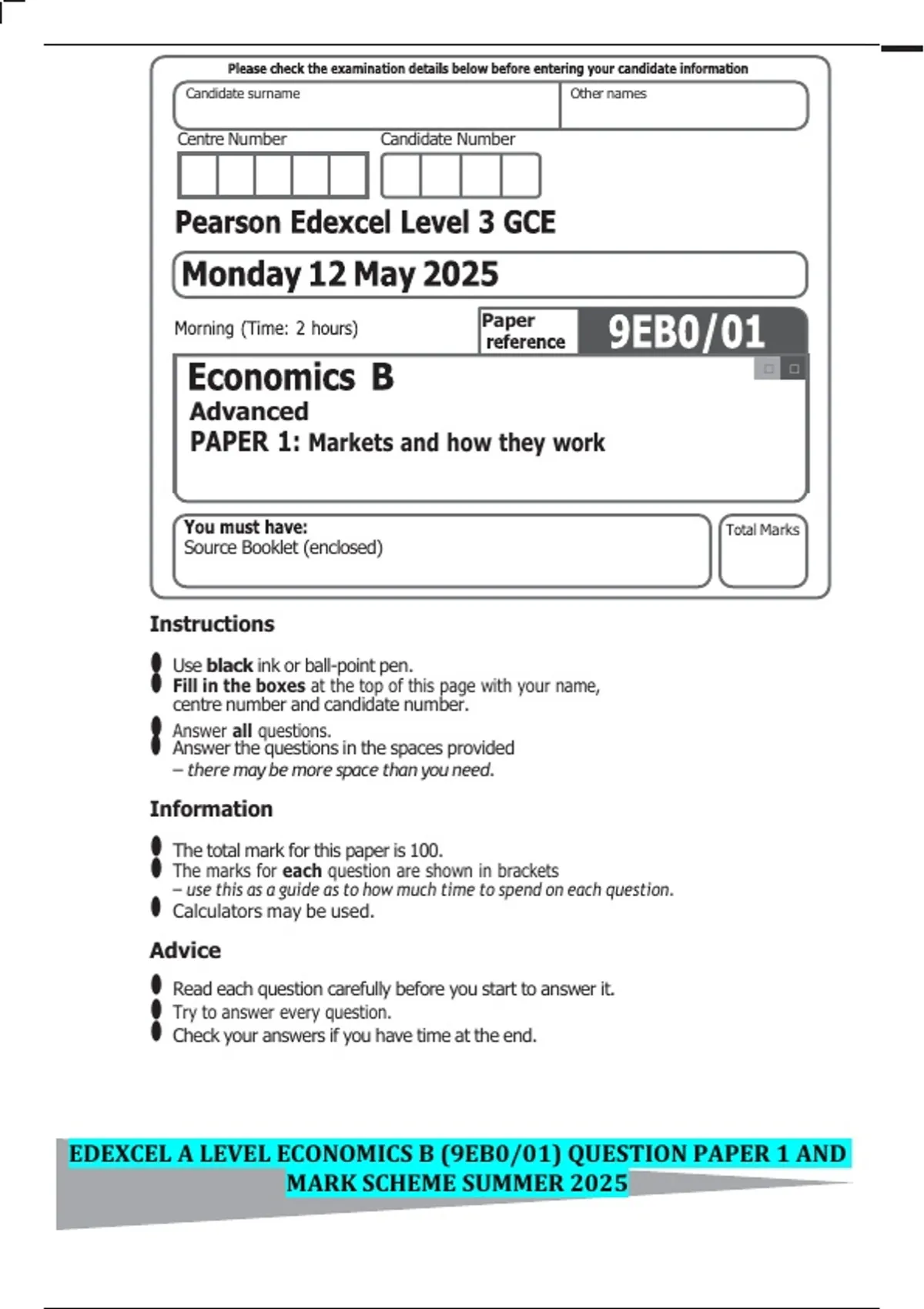 EDEXCEL A LEVEL ECONOMICS B (9EB0/01) QUESTION PAPER 1 AND MARK SCHEME SUMMER 2025