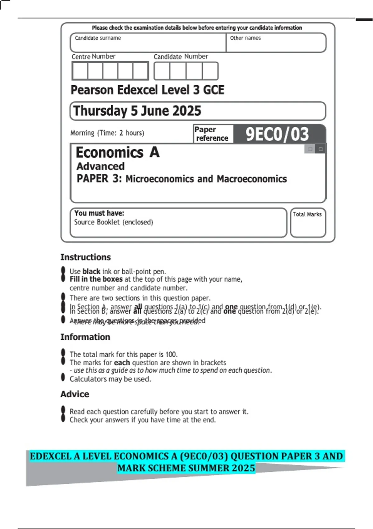 EDEXCEL A LEVEL ECONOMICS A (9EC0/03) QUESTION PAPER 3 AND MARK SCHEME SUMMER 2025