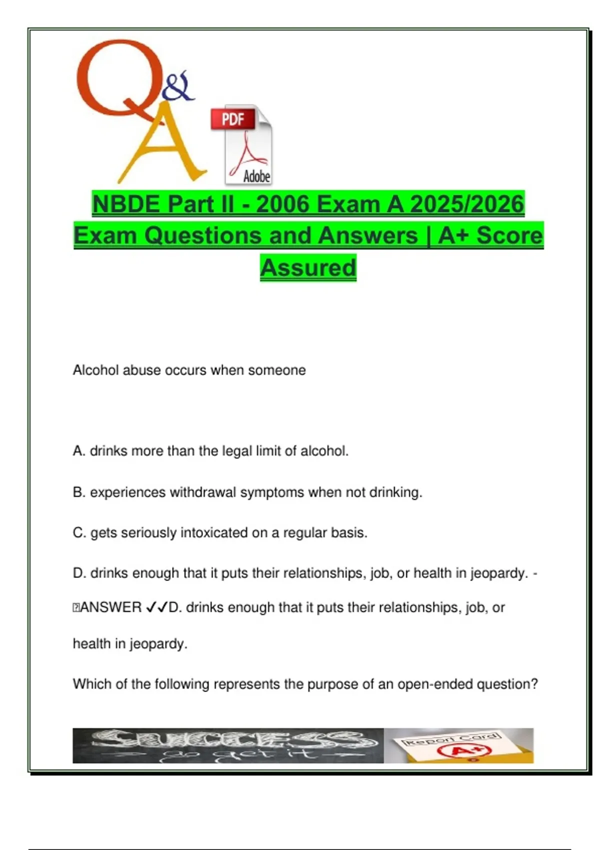 This document contains 200 authentic multiple-choice questions and accurate answers for the NBDE Part II (National Board Dental Examination), based on the 2006 Exam A format and updated for 2025/2026. It thoroughly covers high-yield topics essential for passing the NBDE Part II, including operative dentistry, endodontics, periodontology, prosthodontics, oral pathology, radiology, pharmacology, and behavioral sciences. Each question is immediately followed by the correct answer, making it an excellent tool for self-testing and focused revision. The structure and content align with the official U.S. dental board exam standards, helping students simulate the actual exam experience. It’s especially useful for: DMD and DDS students preparing for NBDE Part II International dental graduates seeking U.S. licensure Candidates preparing for clinical boards and re-examinations The document is suitable for students from accredited dental programs such as NYU College of Dentistry, University of California San Francisco, Harvard School of Dental Medicine, and University of Michigan School of Dentistry. This is a complete, exam-focused resource designed to reinforce clinical knowledge, test-taking skills, and exam confidence. Keywords: NBDE Part II, dental board exam, operative dentistry, endodontics, oral pathology, prosthodontics, periodontology, dental radiology, dental pharmacology, dental ethics, dental exam practice, US dental licensure, clinical dentistry, NBDE questions and answers